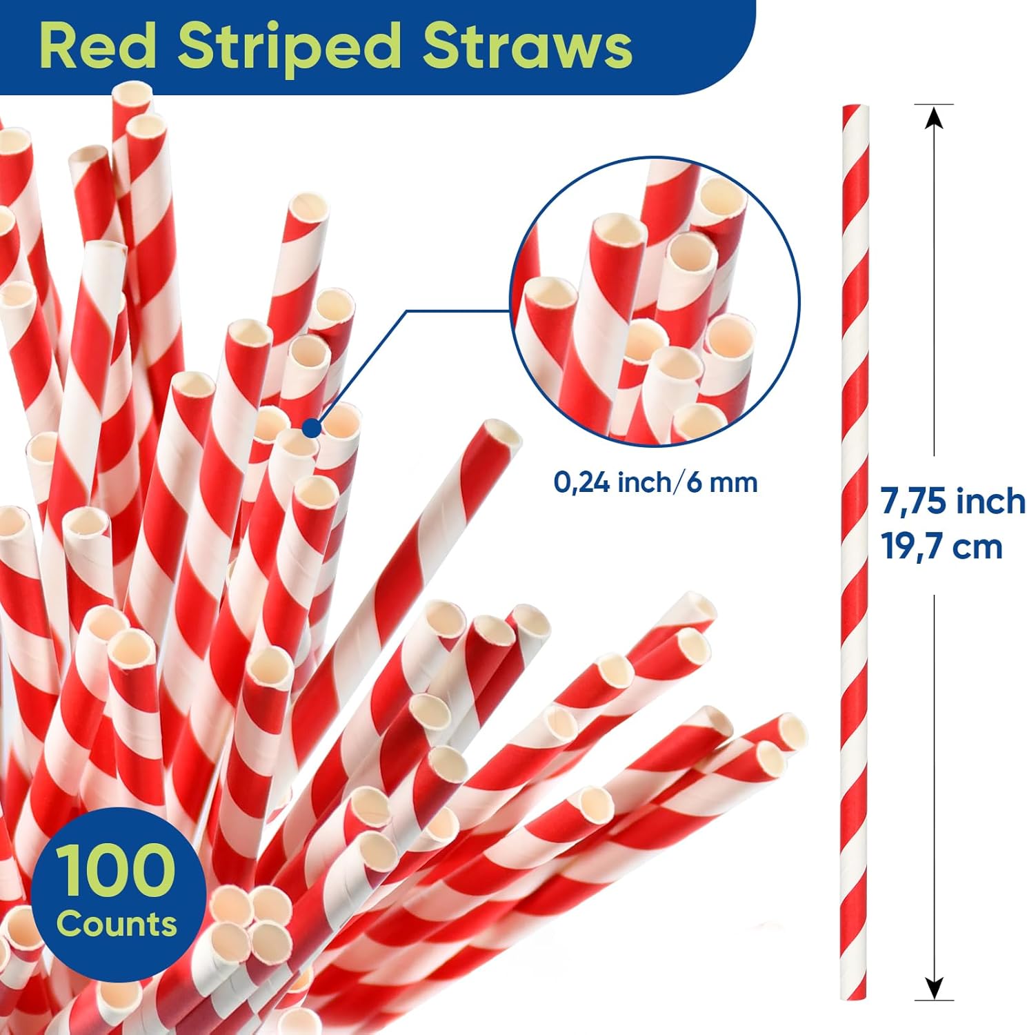 - 【Standard Perfect Size】Pack of 100 unwrapped disposable paper straws in 7.75" (197mm) long and 0.24" (6mm) diameter, matches perfectly to most drinkware, glasses, mugs, fit for 12oz to 24oz cups