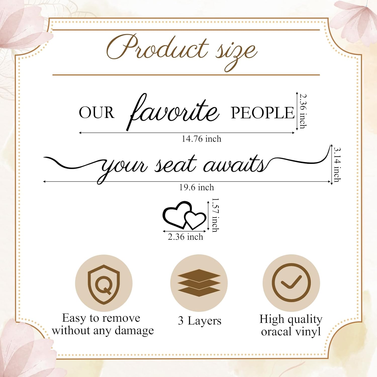 - Ideally Sized for Convenience: these wedding seating chart stickers boast 3 components; 'Our favorite people' measuring about 14.76 x 2.63 inches, 'Your Seat Awaits' sizing to about 19.69 x 2.72 inches, and a charming 'heart' roughly 1.57 x 2.36 inches; These dimensions ensure the decal fits well onto various surfaces while ensuring visibility and attractiveness