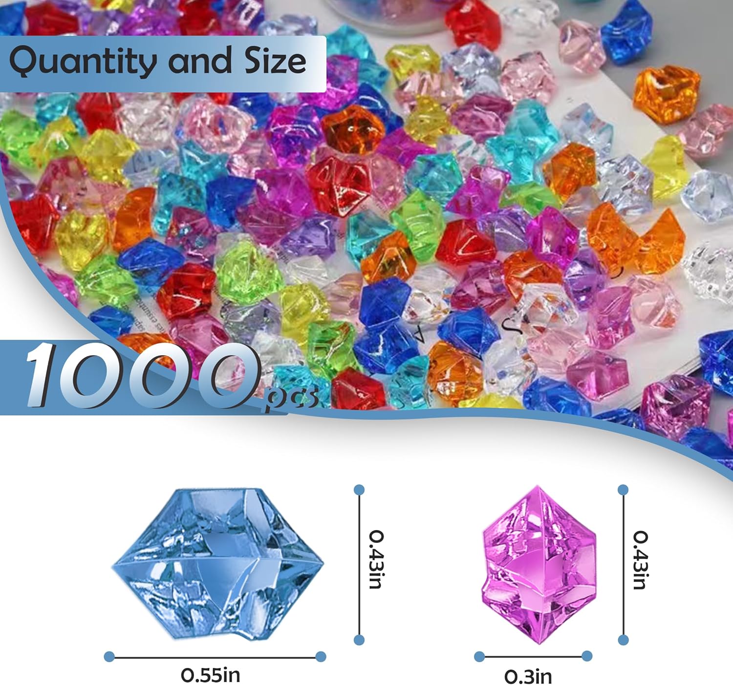 - Package Include: 1000pcs multicolor artificial diamonds(0.55*0.3*0.43 inch). Plenty of quantity and the shiny, chic look is a great choice for DIY decoration.
