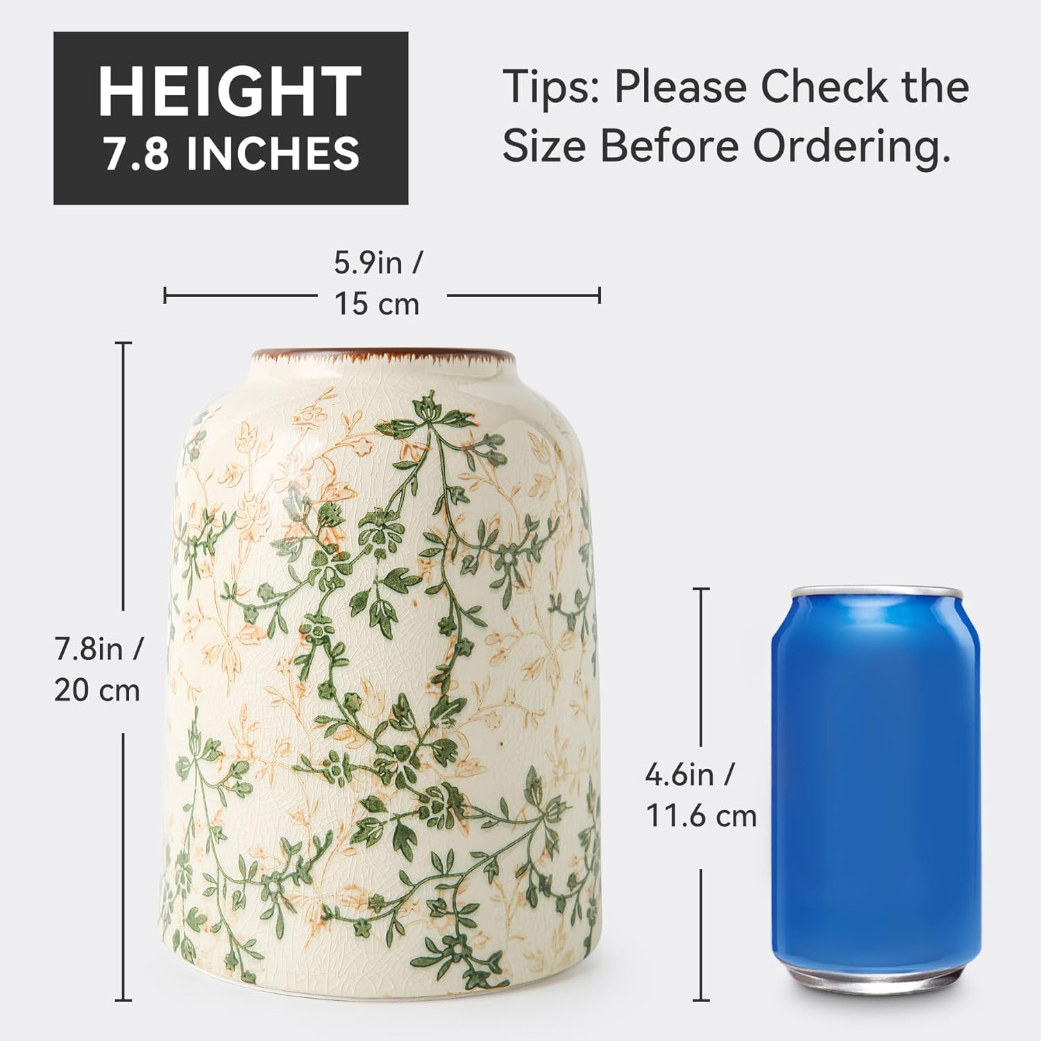 Green Vintage Vase, Chinoiserie Floral Vases, Retro Ice Cracked Ceramic Large Vases for Home Decors, Living Room, Bookshelf, Office, Grand Millennial Decor, Chinoiserie Decors, Tuscan Decor 7.8 Inch