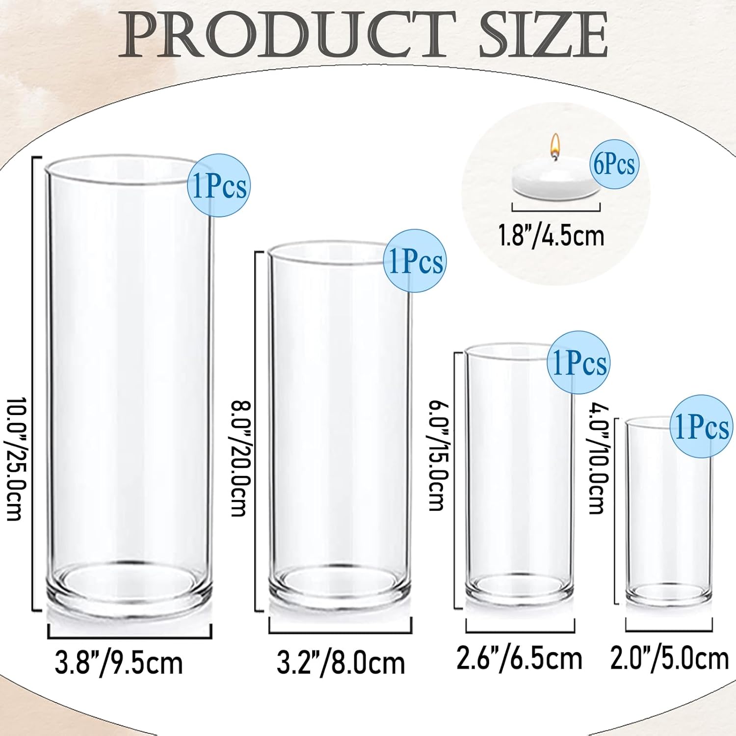 - Versatile Vases for Centerpieces: The set contains 4 pieces clear glass cylinder vases and 6 pieces floating candles, the vases height is about 4,6,8,10 inch, each size 4 pcs and the diameter is about 2.1, 2.5, 3.3, 3.7 inch, it can be meet your different needs, such as: flower arrangement, candle holders, home decor, wedding
