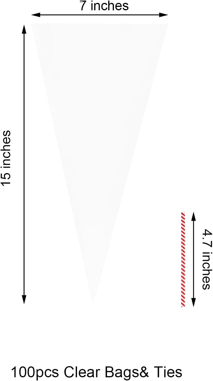 - 【Crystal Clear & Food-Grade Transparency】: Made from premium, extra-thick, food-grade OPP material, our cone bags offer a crystal-clear appearance that beautifully showcases candies, popcorn, handmade gifts, and more. The crisp material enhances the look of your packaging, making it ideal for parties, weddings, and holiday gift wrapping, ensuring your treats stand out.