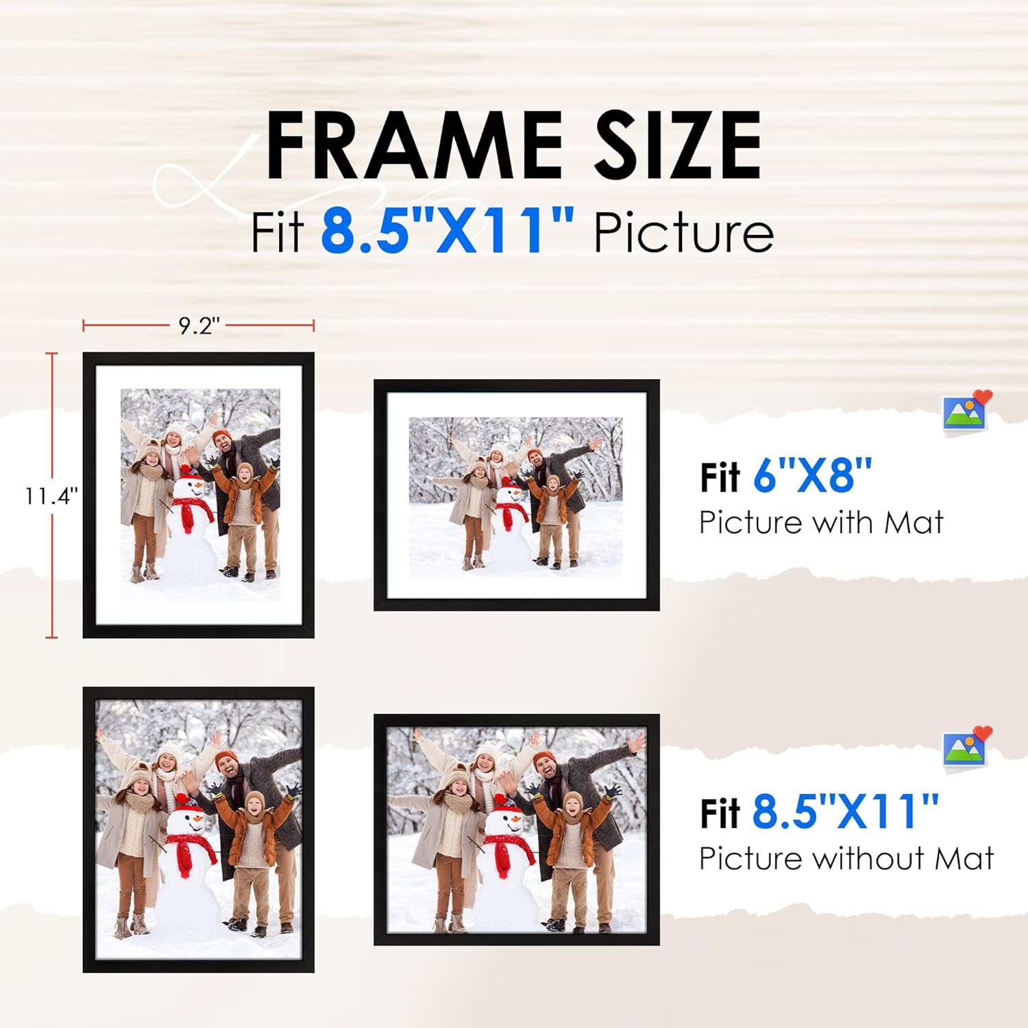 - Vertical & Horizontal Display:The picture frames can be hung on a wall in horizontal and vertical orientations. Fits 6x8 inch pictures with mat or 8.5x11 inch without mat. Ideal frames for gallery wall displays and home décor.