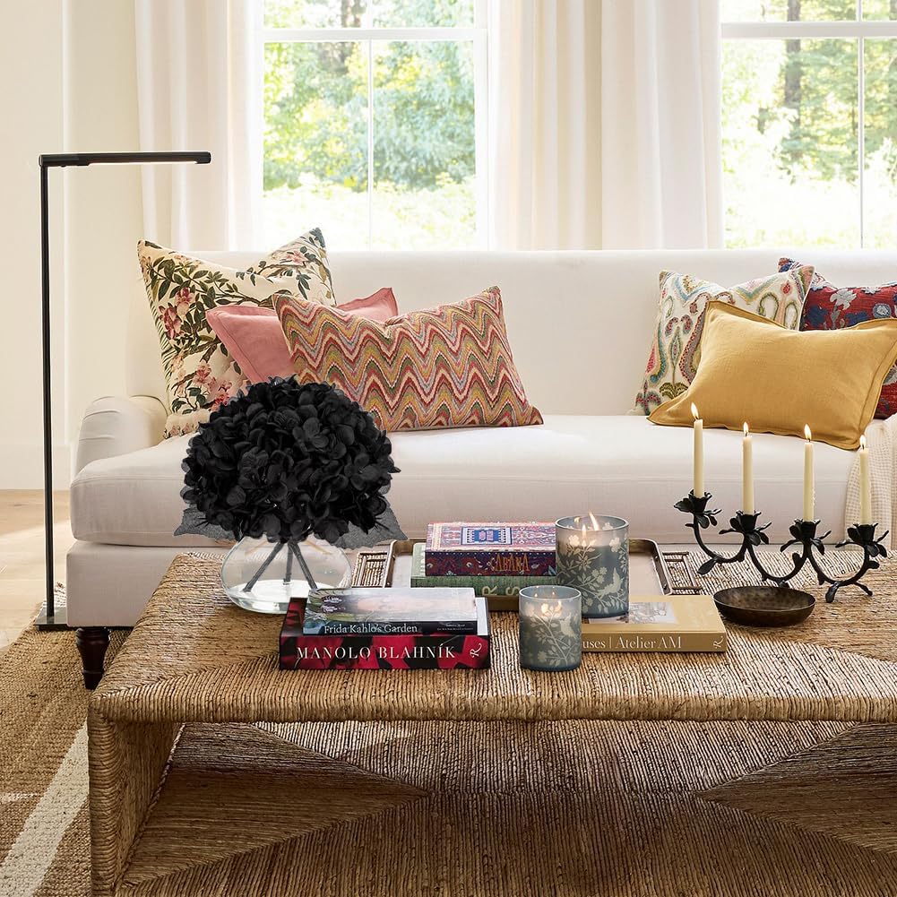 Hollyone Hydrangea Fall Flowers Artificial for Decoration with Glass Vase Black Silk Faux Flowers Arrangements in Vase with Faux Water Fake Floral Bouquet Table Centerpiece Fall Decorations for Home