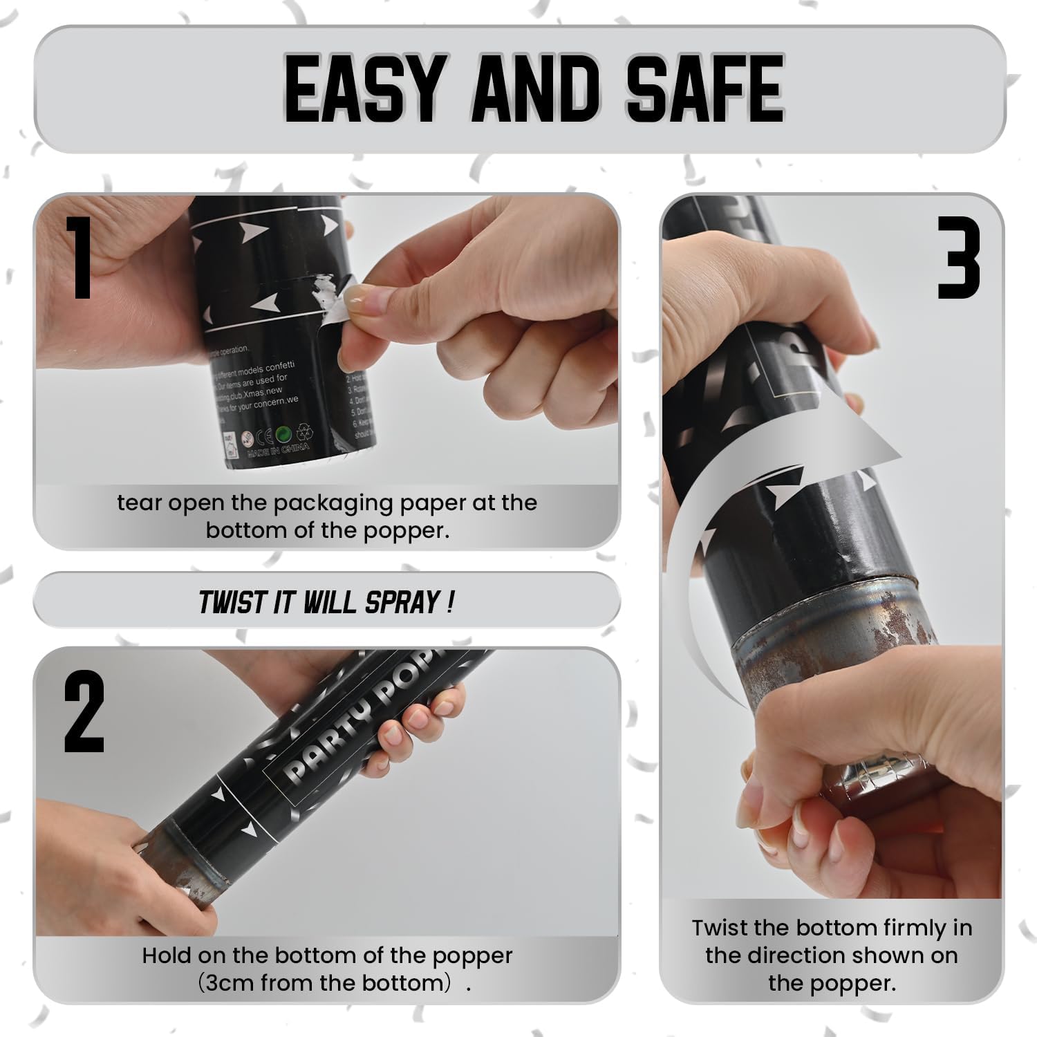 - How To Use Confetti Poppers - Find confetti cannon hard to twist to pop?Maybe you got a wrong way to use confetti poppers. To avoid awkward silence in the beginning, please read the instructions and tear open the packaging paper at the bottom of the popper, then easy to twist it!