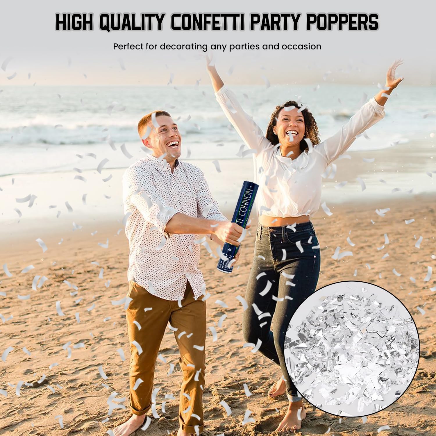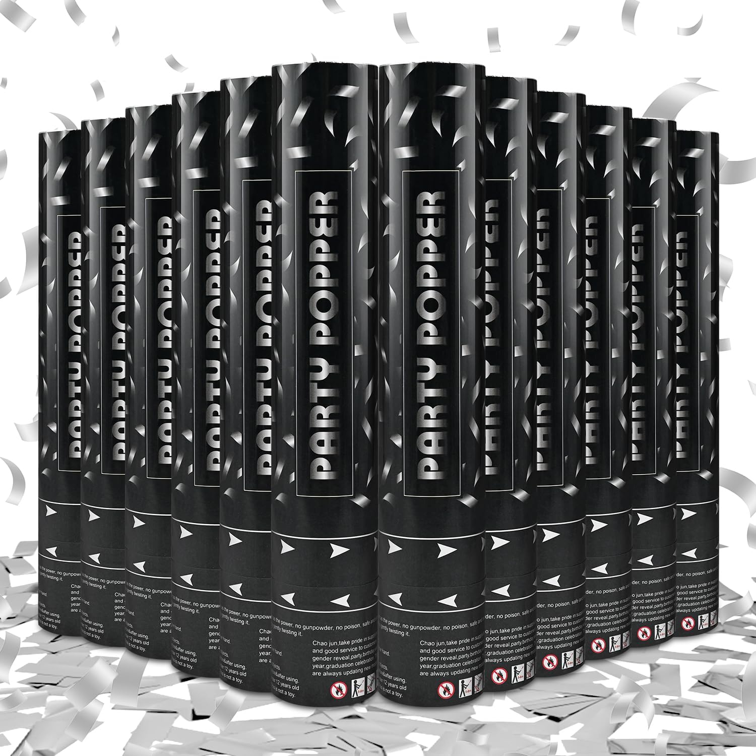 - Party Poppers with Silver Confetti - Our silver mylar confetti poppers are made of high quality confetti, ensuring a celebartion that's both fun and safe. Ideal for any occasion, form weddings and engagements to birthdays and anniversaries, graduation Christmas New Year party.