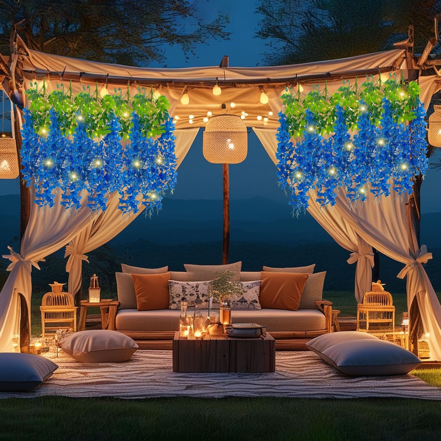 - 【Package Included】12 pieces of silk royal blue wisteria hanging flowers, each length 41.27 inches. Every artificial wisteria garland has 3 branches and 6 leaves, the wisteria flower petal length is 21.62 inches. It also comes with a warm light string that requires 2 AA batteries (Note: There may be some color differences in different lights, product not include batteries)