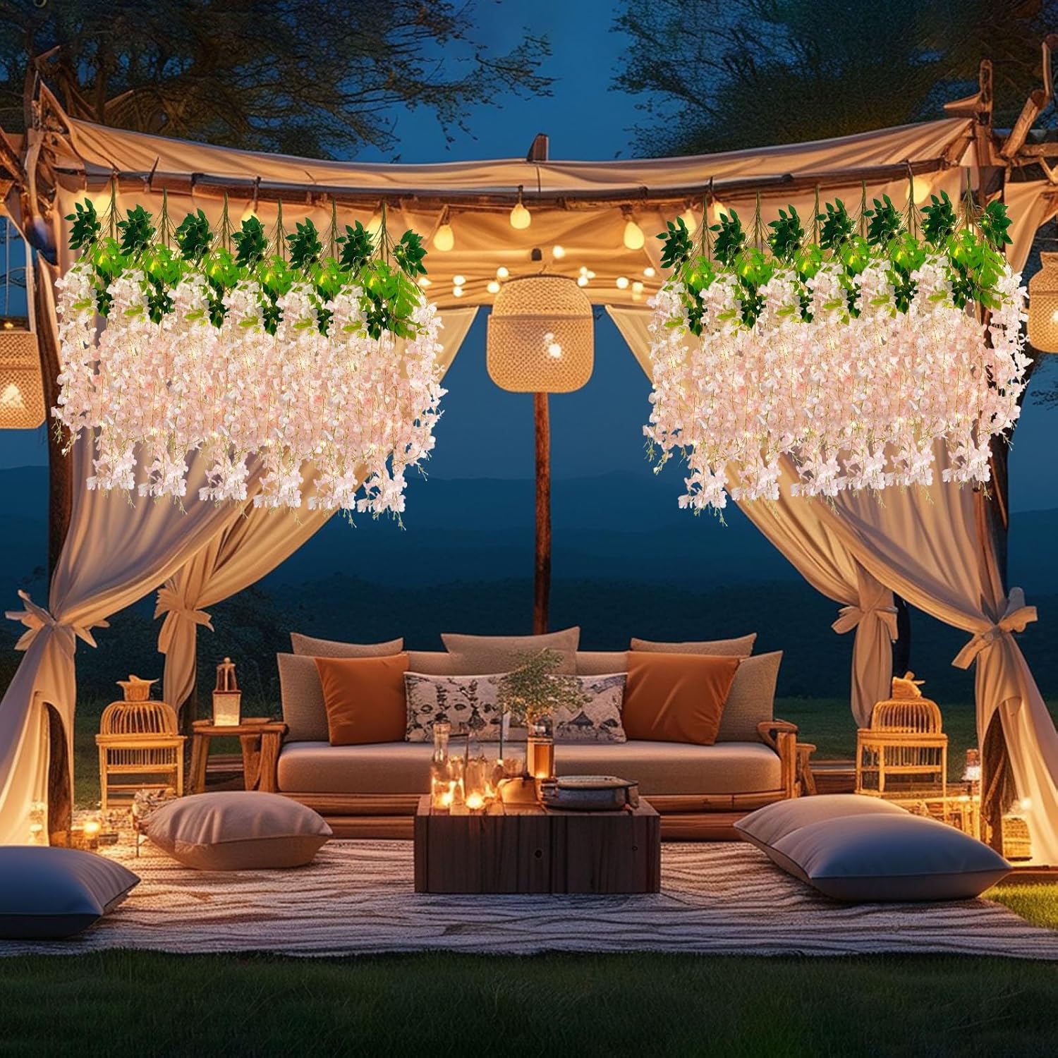- 【Package Included】12 pieces of silk light pink wisteria hanging flowers, each length 41.27 inches. Every artificial wisteria garland has 3 branches and 6 leaves, the wisteria flower petal length is 21.62 inches. It also comes with a warm light string that requires 2 AA batteries (Note: There may be some color differences in different lights, product not include batteries)