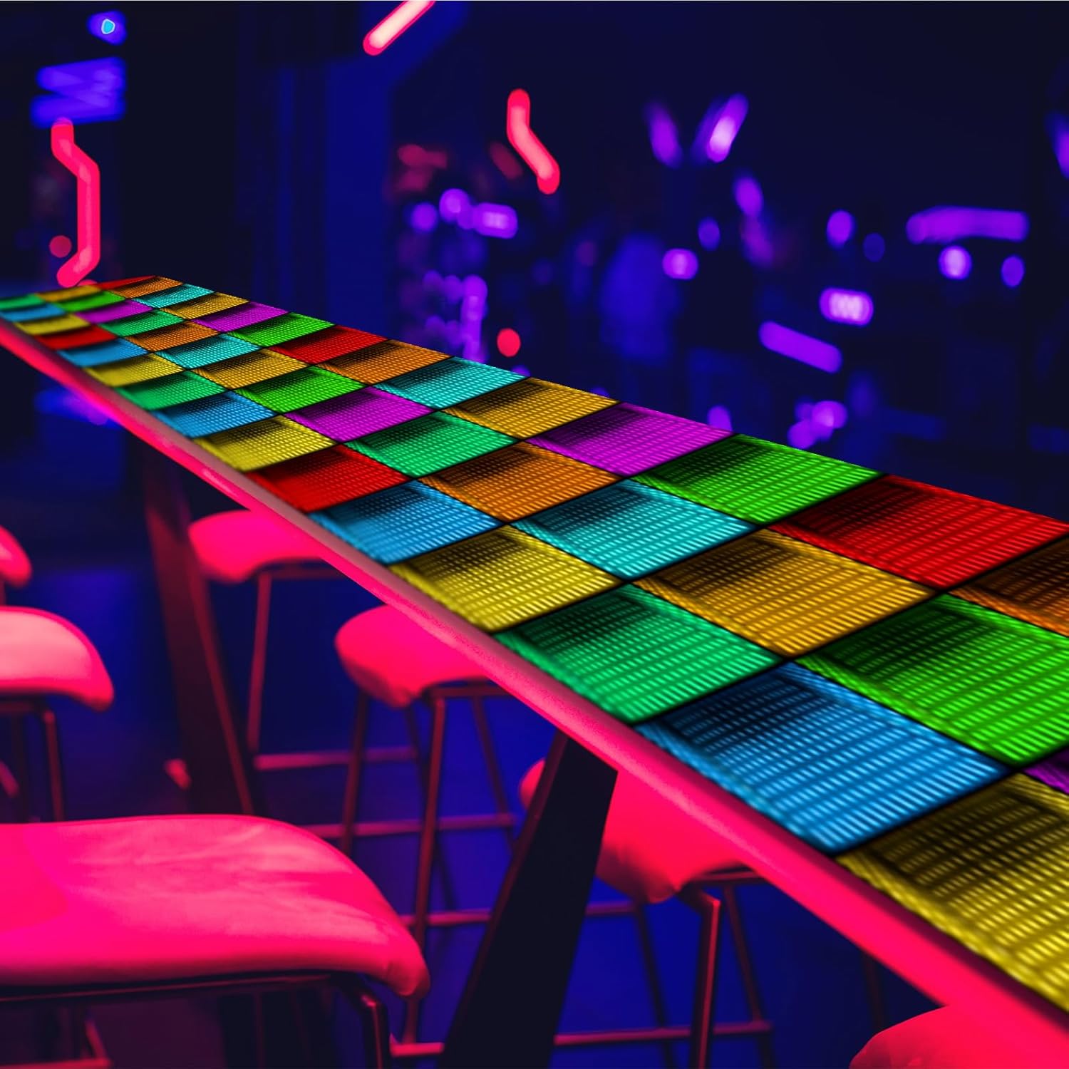 - Bright Fluorescent Color: the neon floor carpet shines brightly under UV blacklight, with fluorescent orange, fluorescent red, fluorescent green, fluorescent yellow, and fluorescent purple grid staggered against each other, making it simple to draw the attention of others; Please note that it will have the effect of fluorescence, but it needs to be irradiated by purple lamp to have the effect; If it is not irradiated, it is a normal pattern