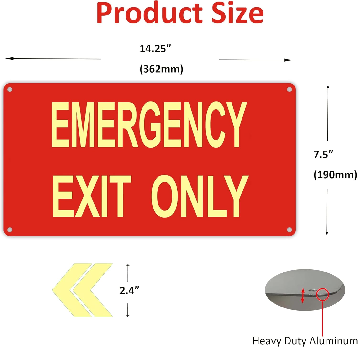 (2Pack) Photoluminescent Emergency Exit Sign Red, Glow In The Dark Aluminum Exit Sign - Adhesive Backing - 4pcs Removable Arrows Included - 14.25 x 7.5 Inches - Non Electrical Exit