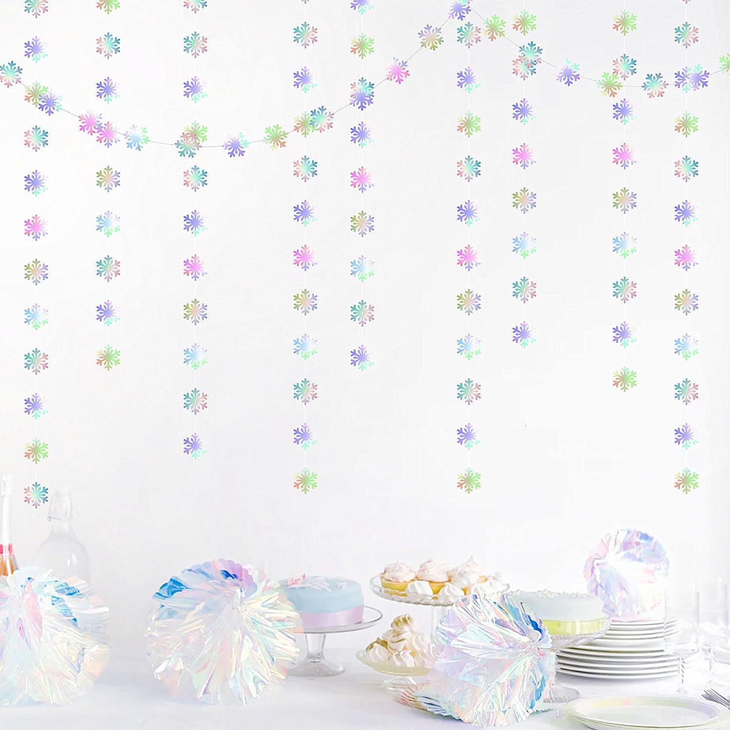 - 【Wide Use】These streamers garland are great for indoor and outdoor events such as christmas ornaments,frozen glitter birthday party ,winter wonderland decorations,snowflake decorations,disco iridescent dance party,euphoria party,baby shower ceiling decorations.