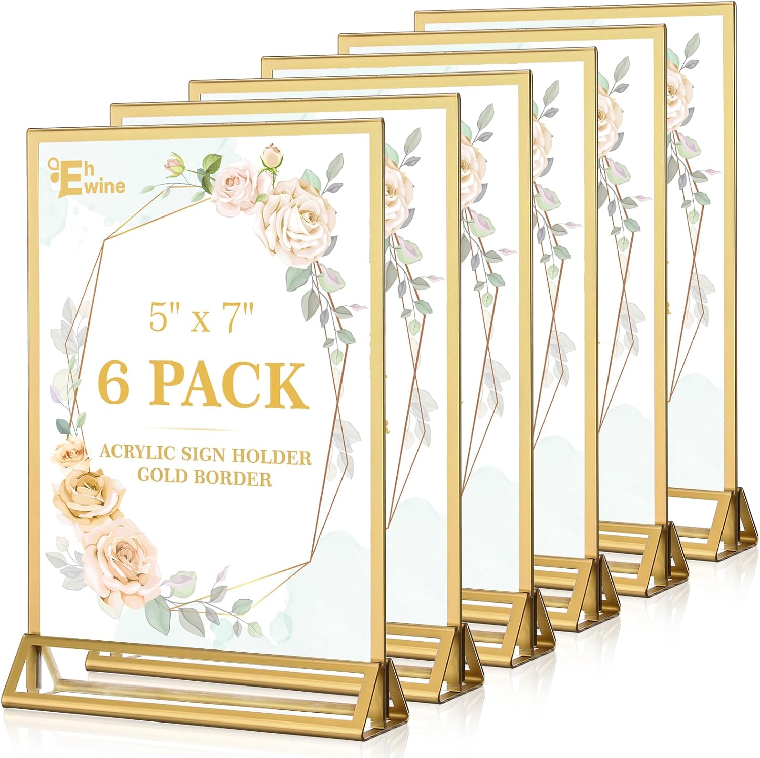 EHWINE 6 Pack Acrylic Sign Holder 5 x 7, Double Sided Gold Picture Frame Stand up Table Top Sign Holders, Clear Display Stand Menu Flyer Holder for Wedding Party