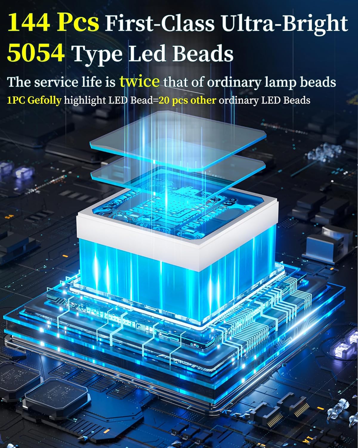 - [Ultra Bright 5054 Type Led Beads] - Designed with 144pcs first-class super bright 5054 type LED beads, 1 of our Gefolly beads is as bright as 20 ordinary beads. The lighting area is up to 3800 square feet, reducing lighting blind spots. Escort for the safety of you and your family. The first choice for night lighting.