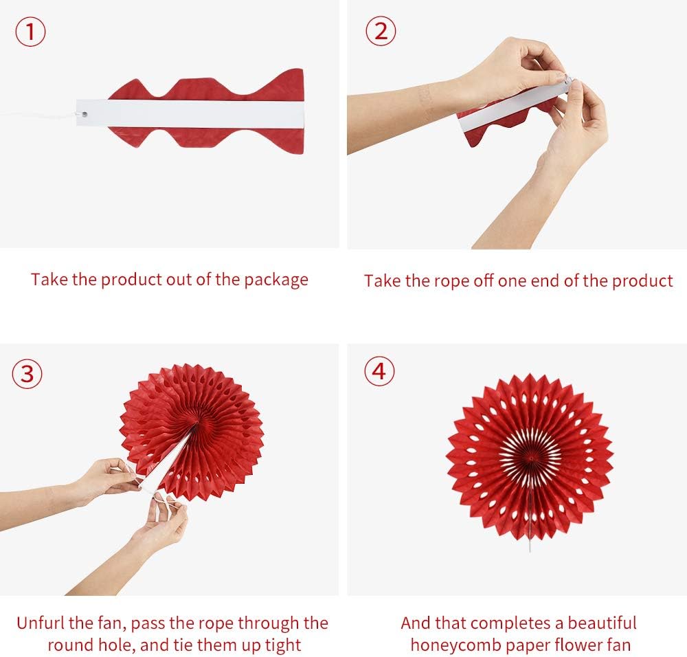 - Easy to assemble and uniquely designed:These hanging paper fans have a hanging string attached,just unfold the paper flower fan and fix it with the rope of the paper flower fan, then you can hang it to your favorite place and decorate your party perfectly in a few minutes