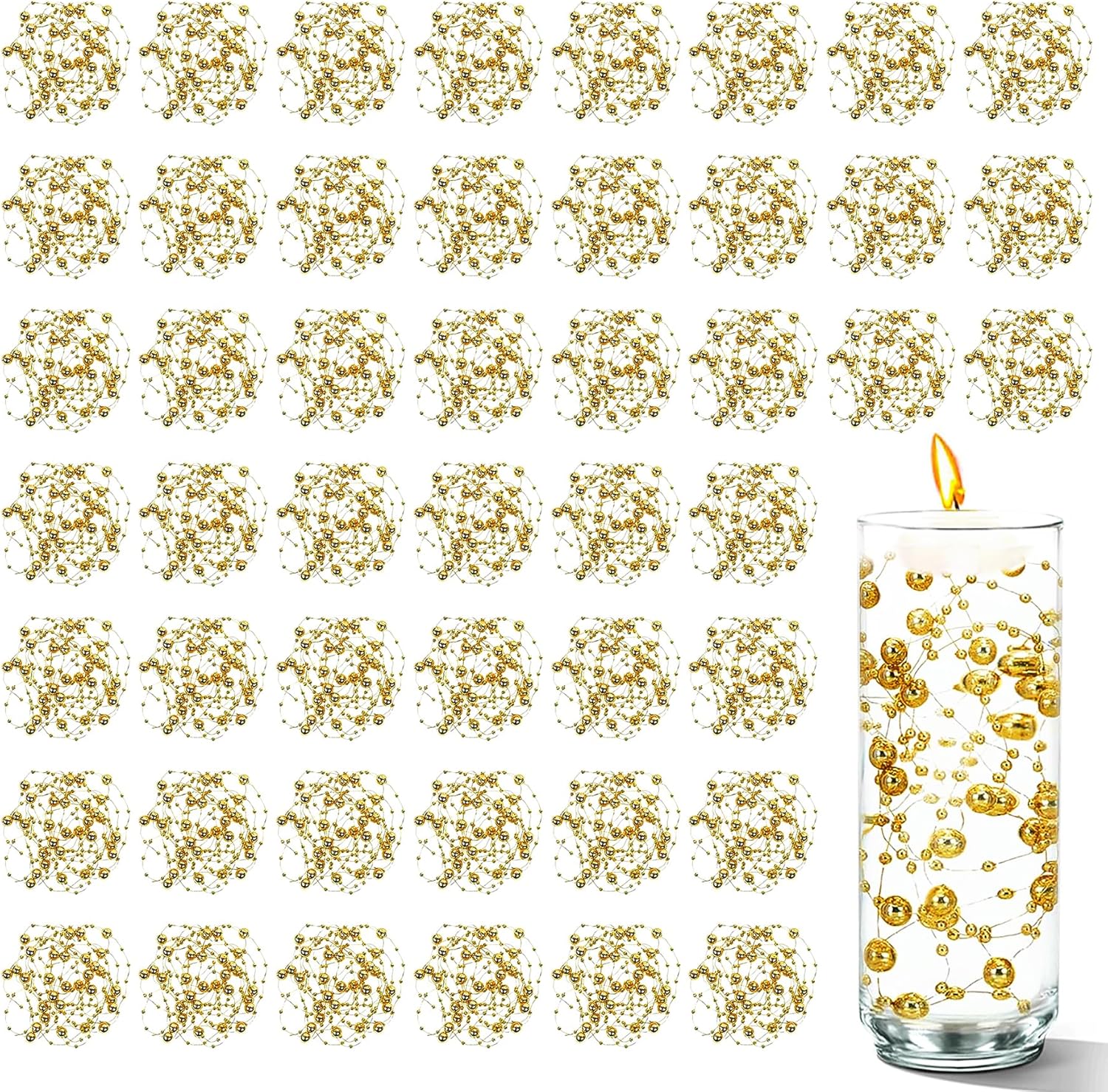 - Pearl String Beads: These artificial fake pearls strands are designed for floating candles, easy to use, just fill the string beads into the floating candle glass candle holders; you can also fill the vase with water and add 2 or 3 strands of beads string, which will make the centerpiece more romantic and gorgeous, for tall or large vases, just fill it with more strands of pearl decorations to bring a rich and luxurious look to your precious vase filler