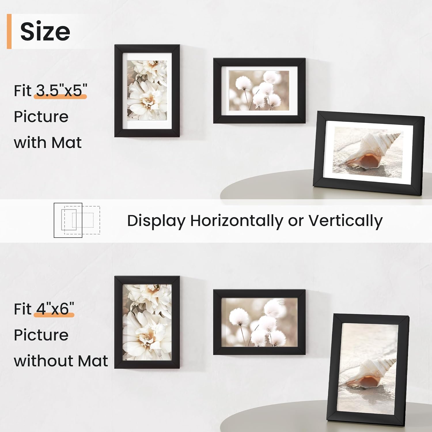 - Vertical & Horizontal Display - Our wall photo frames are versatile and easy to clip and hang. You can mount this plastic picture frame horizontally or vertically, with hanging hardware included. This picture frame maximizes your available space.