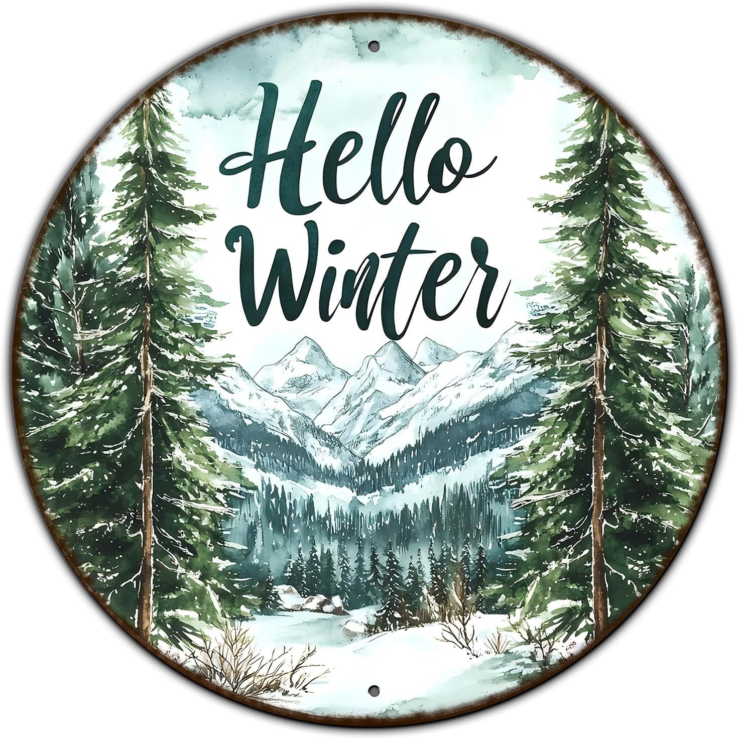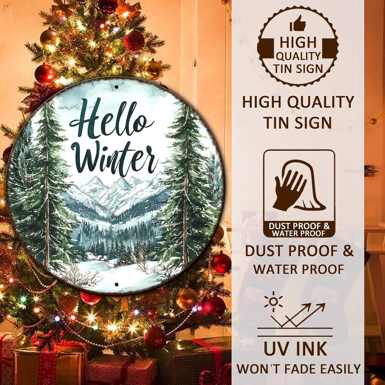 Round Christmas Metal Tin Sign Hello Winter Sign Christmas Pine Trees Welcome Door Sign Xmas Winter Holiday Farmhouse Rustic Wreath Sign for Indoor Outdoor Home Wall Window Decor 12*12 in