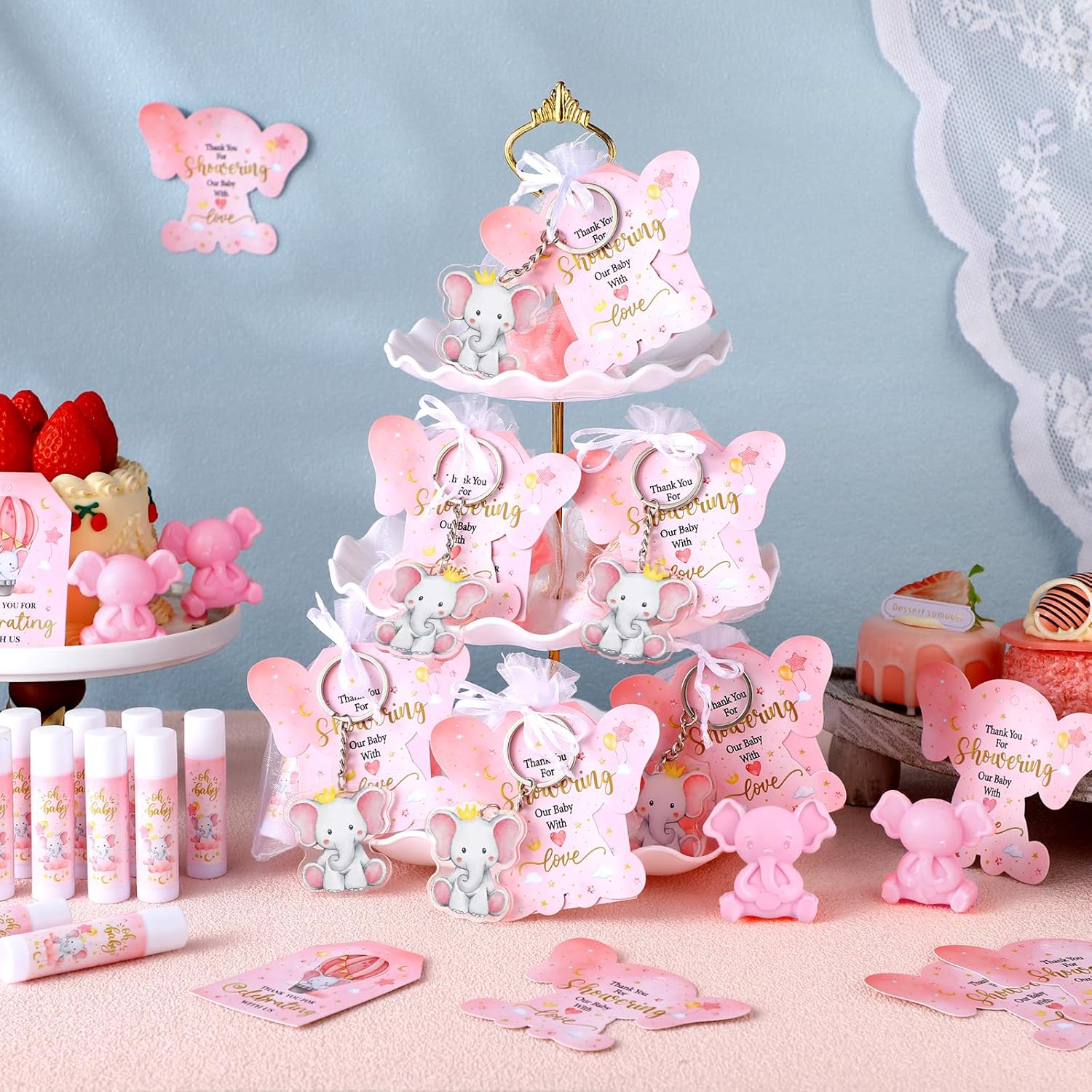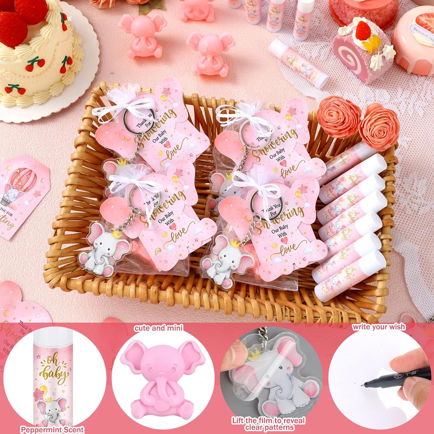 - Complete Baby Shower Favor Sets: enjoy a comprehensive baby shower favors set that are suitable for a baby shower; Each package includes 48 lip balms, 48 elephant shaped soaps, 48 elephant keychains, 48 organza bags, 48 thank you tags, and 48 elephant shaped cards; These can be individually packaged in organza bags alongside a thank you tag, offering a sophisticated and heartfelt gesture to appreciate your guests