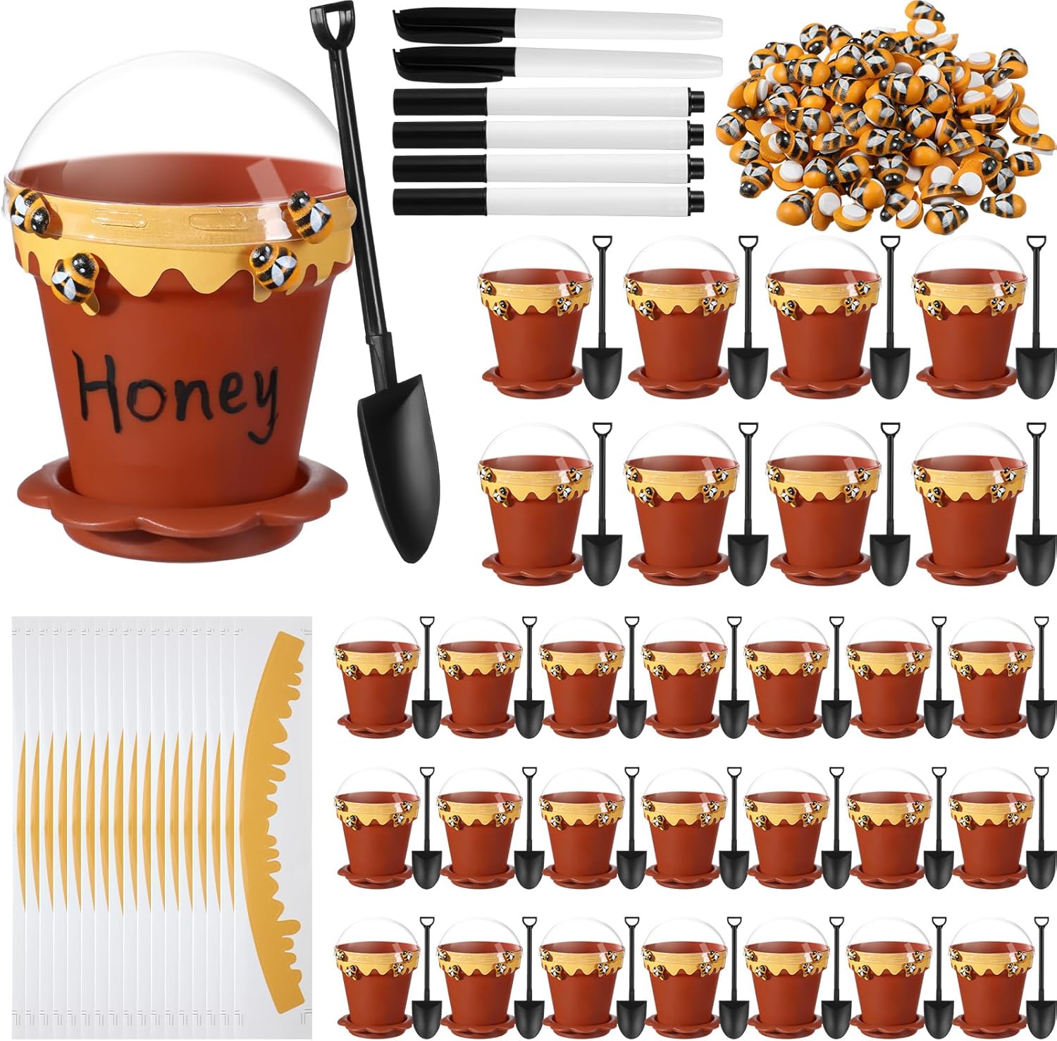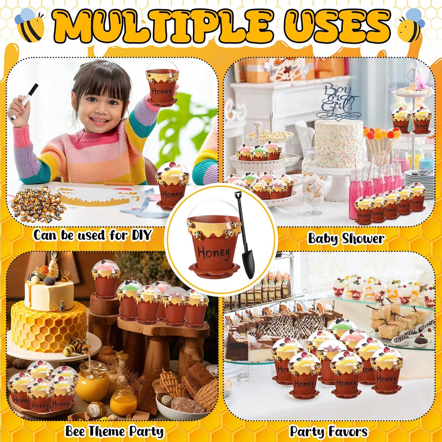 - Package Contains: includes 30 mini honey bee pots, 30 lids, 30 saucers, 30 shovel shaped spoon, 30 stickers, 120 wooden yellow bee decorations, 4 erasable markers, 2 indelible markers, ideal for DIY gifts, unleash your artistic talent to create a special and vibrant display, add fun to your bee party, birthday party, baby shower
