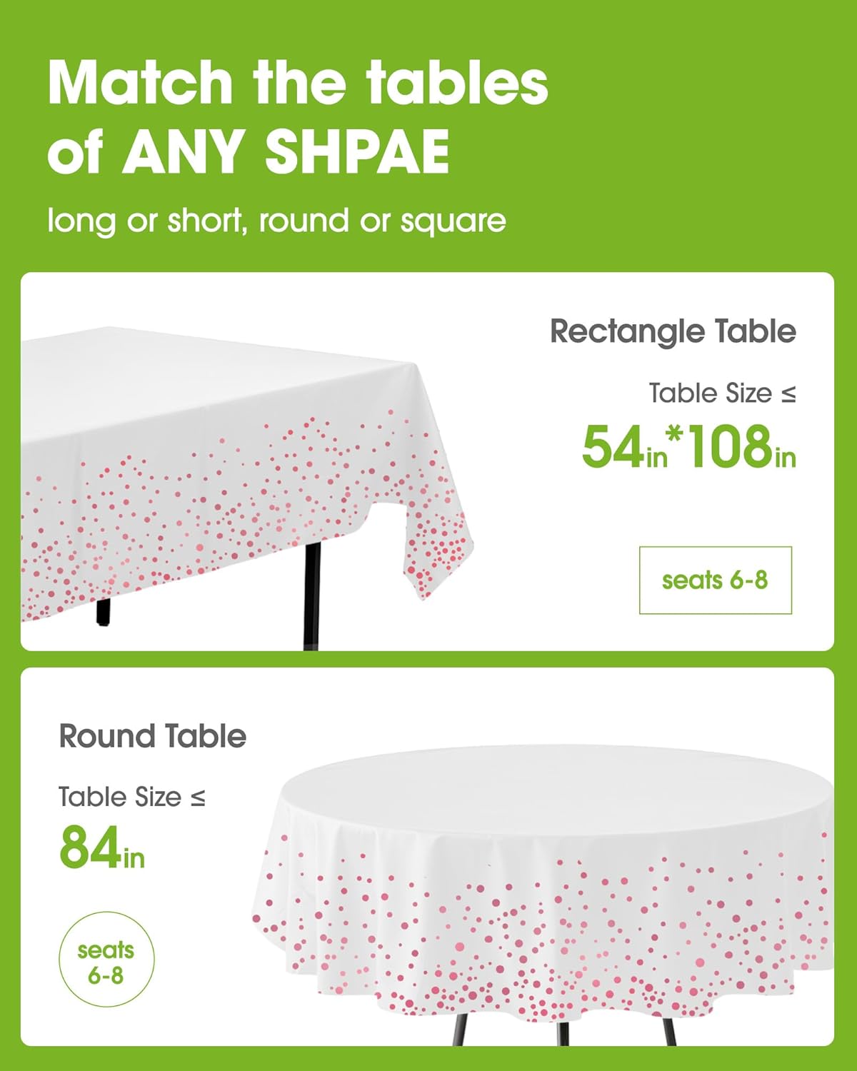- FIT ANY SHAPE OF TABLES: Pureegg disposable tablecloths for rectangle tables measure 54" x 108" and fit tables up to 8 feet long. These plastic table cloths also fit smaller tables or various kinds of tables, like folding buffets, outdoor picnic, kitchen, and dining tables.