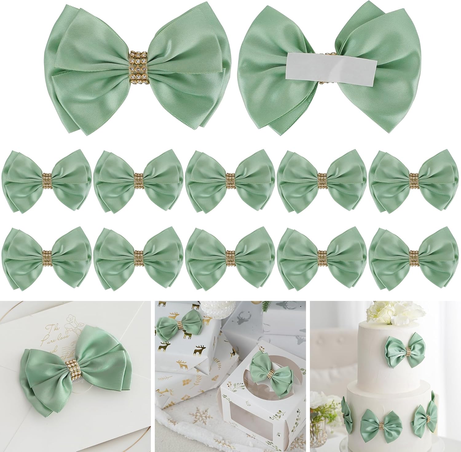Moss Green Ribbon Bows 4'' Premade Satin Bow, Gift Bows with Rhinestone, Wrapping Bows for Presents, Greeting Cards, Treat Bags, Wine Bottles, Valentines Bows for Gift Wrapping-12 Counts