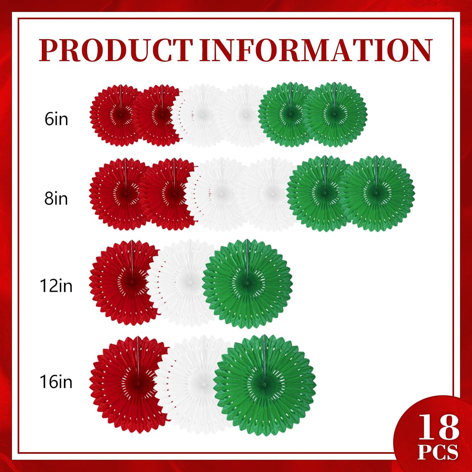 - 【Hanging paper fan set】Paper fan set includes 18 paper fans of different sizes, among which the paper flower fan size is 14 inches * 3, 12 inches * 5, 8 inches * 6, and 6 inches*6.