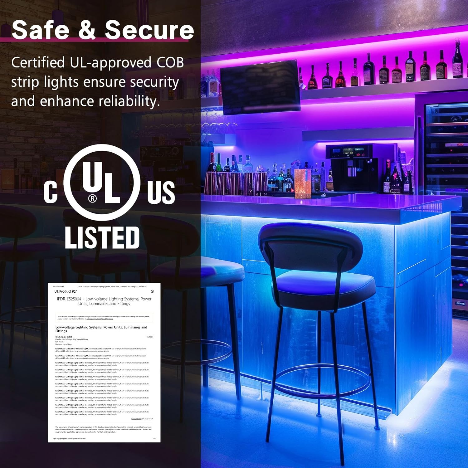 - 【Safety and Quality Control】 Enjoy peace of mind with our UL Listed strip lights and ETL power supply. Third-party tested for safety, quality, and energy efficiency, meet strict standards for security and satisfaction. Ideal for various applications, they offer reliability, longevity, and reduced energy costs.