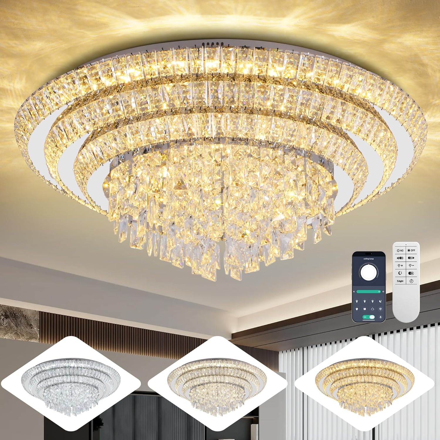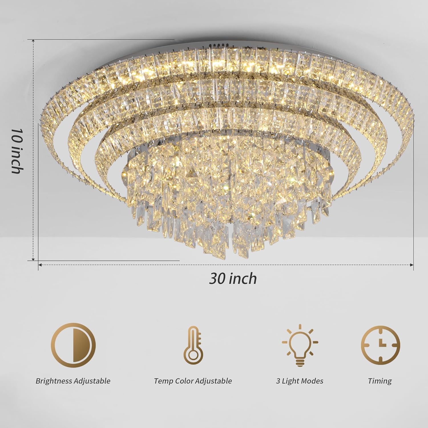 - Crystal flush mount ceiling light: made of K9 crystal and stainless steel; 3 modes lights Warm/natural/white is adjustable with wall switch; Coming remote is easy to control for all functions and temp or brightness's control.