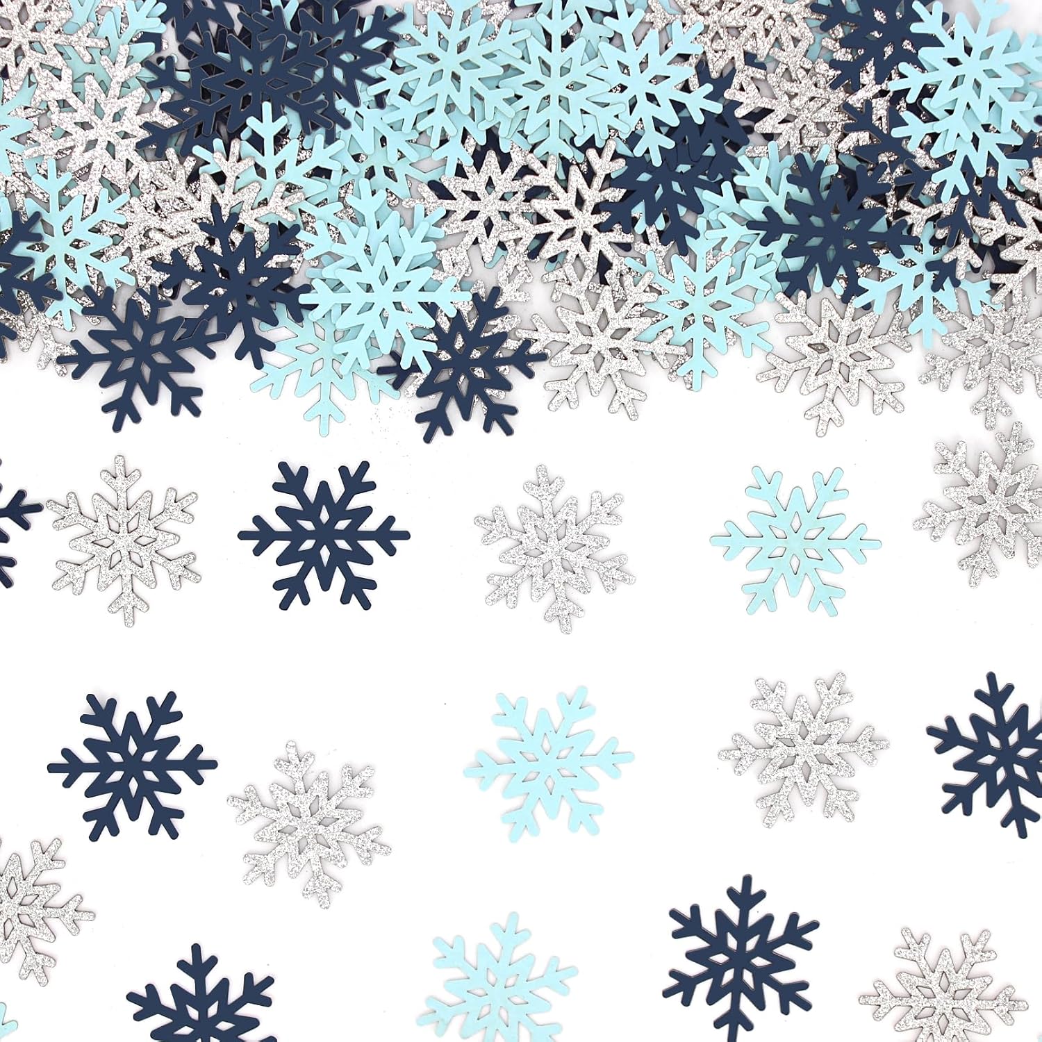 - Premium quality,proper size.The small snowflakes for crafts are made from premium glittery silver paper card and well cut,the colors matched well.The baby blue snowflake decor confetti size is 1.2inch,perfect for holiday crafts,recommend as table decorations or craft supply.