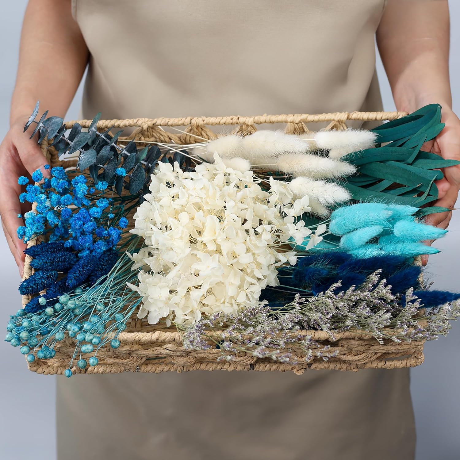 - MATERIALS: blue premium mixed dried flowers contain 10 different colours of natural dried flowers, specifically white and peacock blue hare's tail flowers, eucalyptus leaves, sea lavender, hydrangea, blue baby's breath flowers, fuchsia beans, and comes with DIY twine accessories.