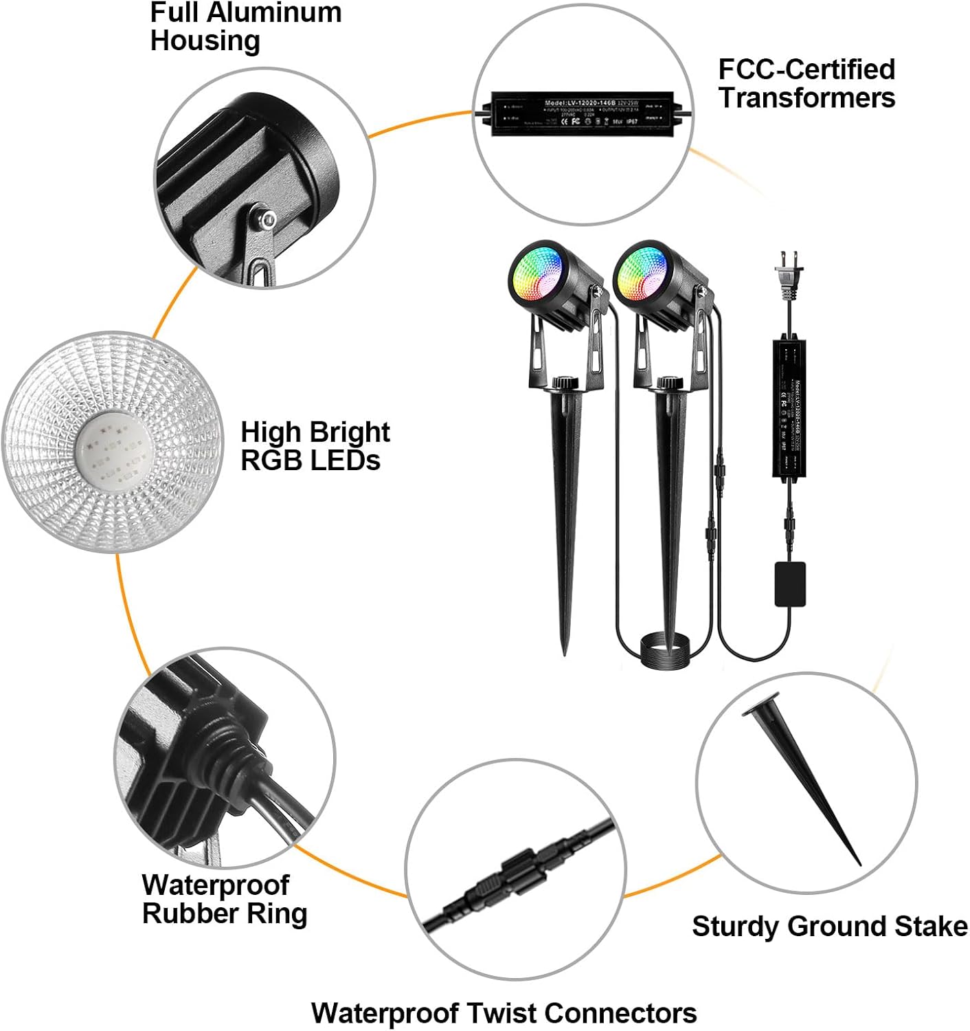 - 【Color Changing Landscape Lighting Effects】-You can control the entire set of rgb landscape spotlights with remote, which makes it easy to DIY and change the color or pattern of the spotlights(16 light colors, 7 levels of brightness adjustment, two light modes). With the timer function, the light can be turned on or off automatically at a predetermined time, bringing more convenience for outdoor decoration.