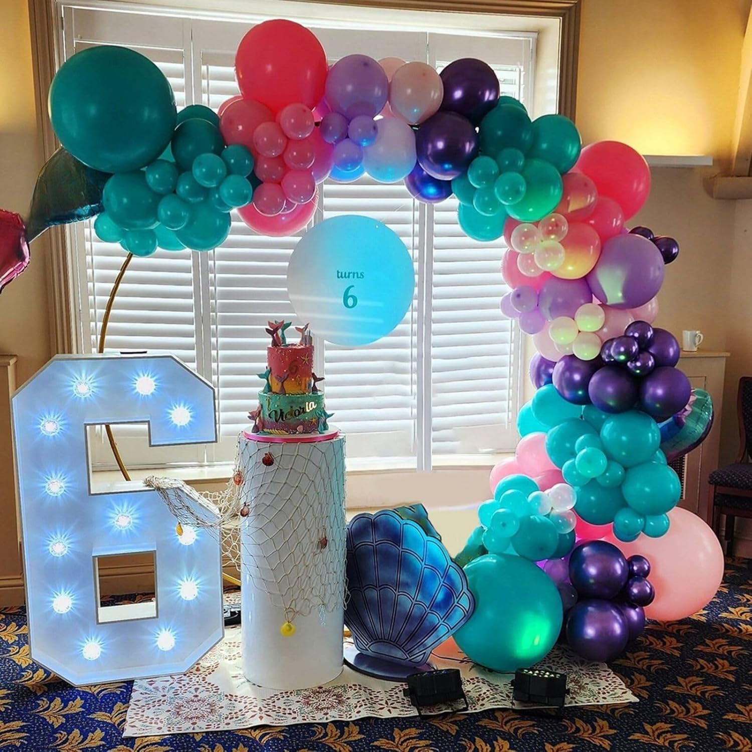 - 12 inch Teal Blue Purple Balloons: 52 Pcs pink purple balloons set including 10* hot pink balloons, 10* teal blue balloons, 10* maca pink balloons, 7* meatllic purple balloons, 7* pearl light purple balloons, 6* blue pink confetti balloons, 2* white ribbons. Whether it’s a baby shower, wedding birthday party, or any theme celebration, these balloons will bring a unique visual appeal to your venue