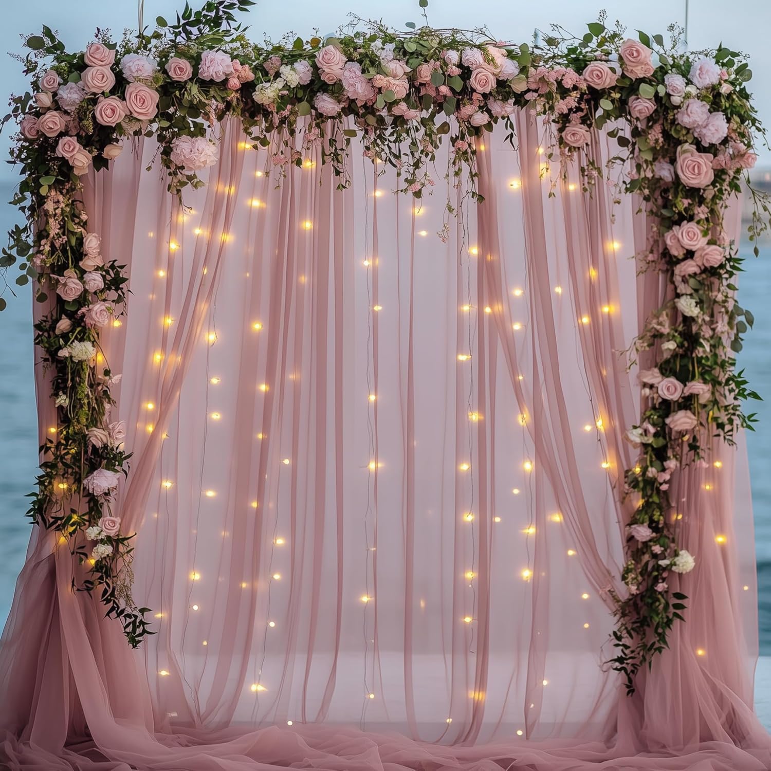 - Package Includes: 2 panels dusty rose tulle backdrop curtains, each sheer curtain backdrop is 5FT width and 10FT height. Also it includes a set of 10FT (10 strands) warm string light (USB powered,no remote control) and 12pcs transparent clips.