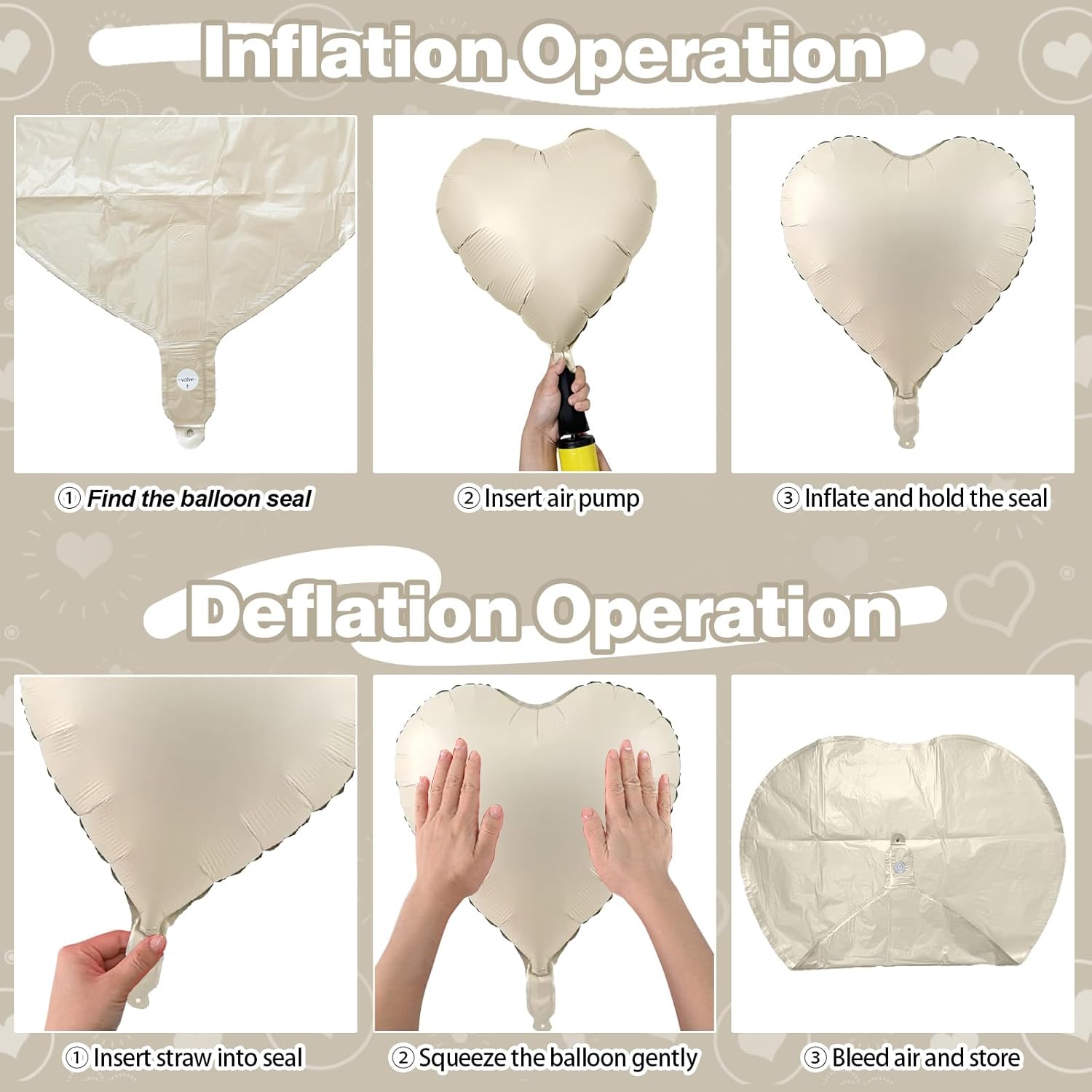 - Easy to Use: The beige brown heart foil balloons can inflate with helium or air, can be self-sealed. It is recommended to inflate to 85%-90% to prevent the balloon from bursting