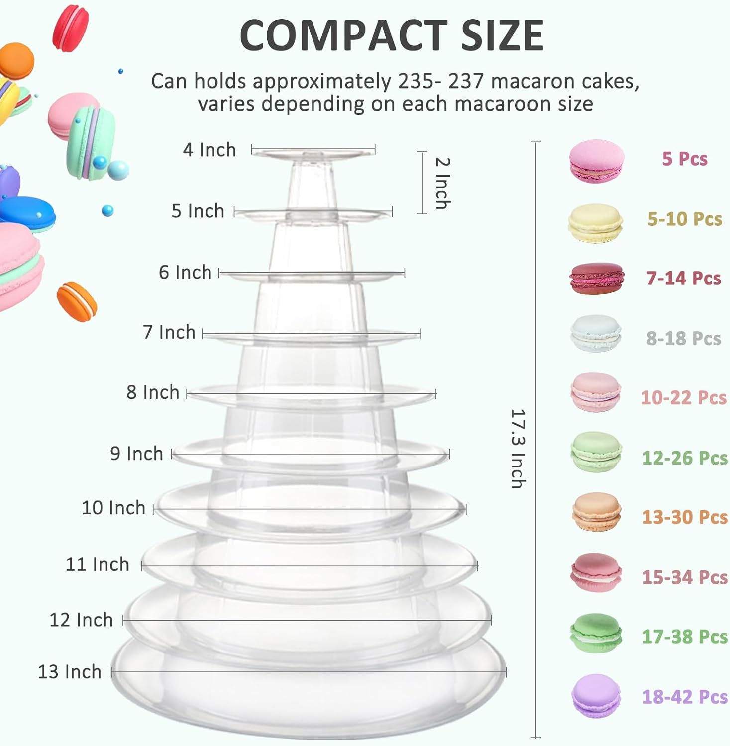 - 【COMPACT SIZE RACK】This 10 tiers cupcake display rack is about 17.3 inch in height, 4-13 inch in diameter, space between tiers is about 2 inch. Plastic tower stand can holds approximately 235-237 macaroons (depending on each macaron size and how you place it)