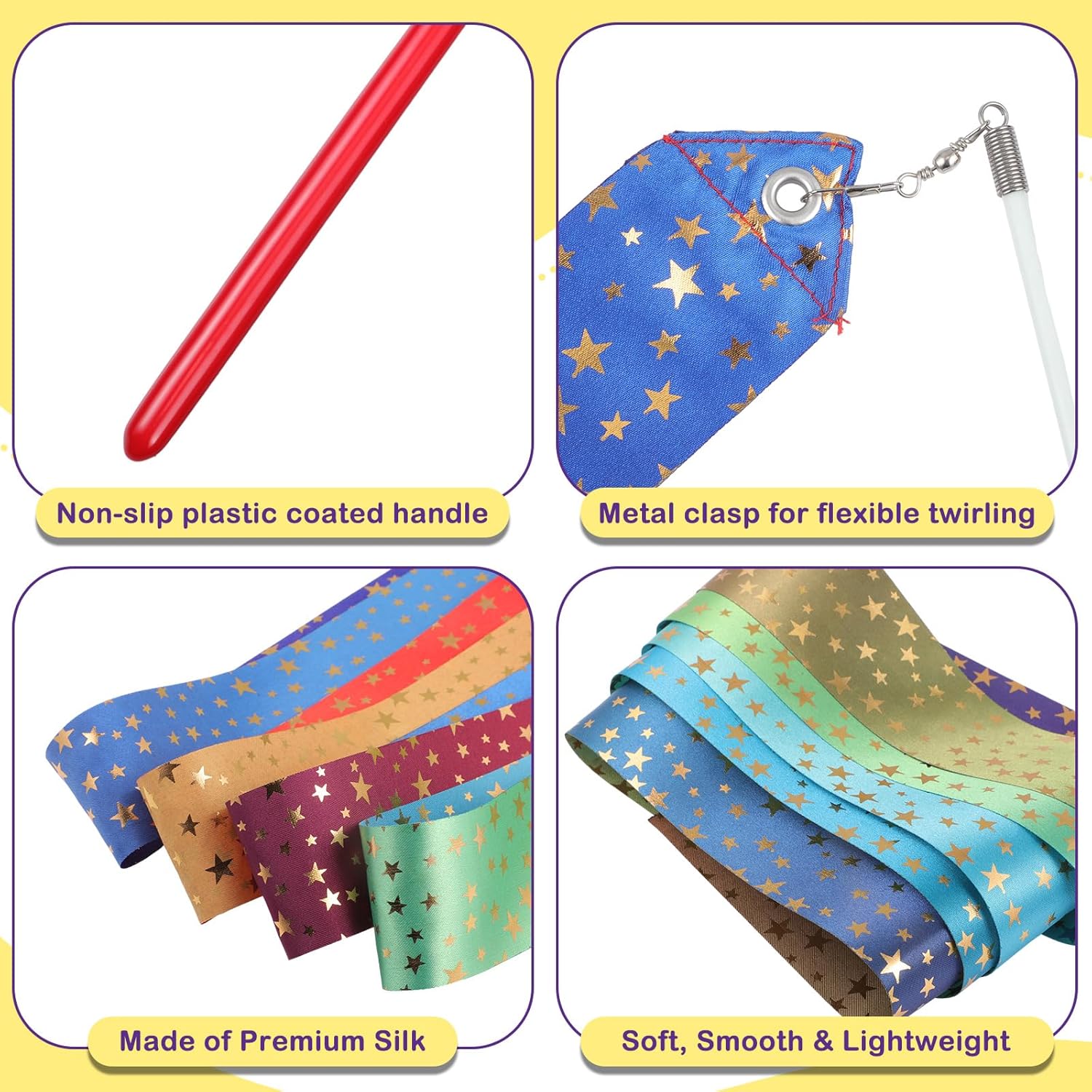 - Quality Material: the rhythmic gymnastics ribbon is made of soft satin material, lightweight and wear resistant, beautiful and bright colors printed on the surface will not easily fade; The ribbon stick is sturdy and hard to break, can serve you for a long term; The handle does not slip easily when twirling the ribbon; Metal buckle at the top of the stick provides flexible rotation for the ribbon