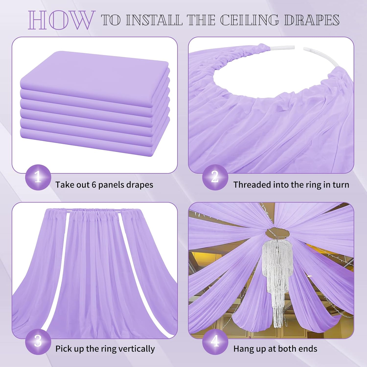 - 【Chiffon Fabric Curtain】The package will include 6 panels lavender wedding ceiling drapes (Not include stand !!!), each wedding extra long curtain measures 5 feet(60inch)wide x30 feet(360inch) long. Sufficient quantity can meet your needs. These arch draping are applicable for any indoor and outdoor occasion either for decorative or functional uses.