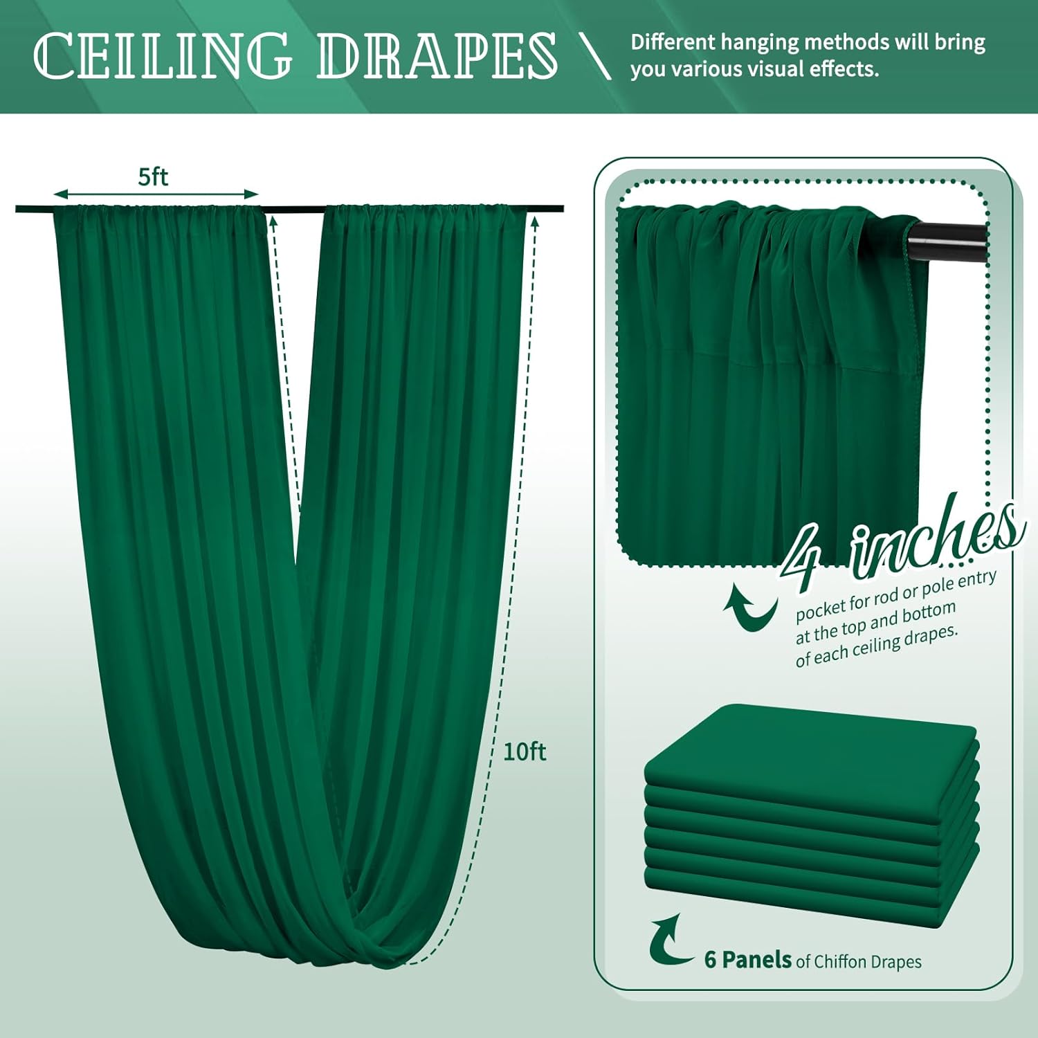 6 Panels Emerald Green Ceiling Drapes for Wedding 5ftx10ft Chiffon Fabric Arch Draping Curtains Sheer Drapery for Party Ceremony Birthday Baby Shower Reception Stage Swag Ceiling Decorations