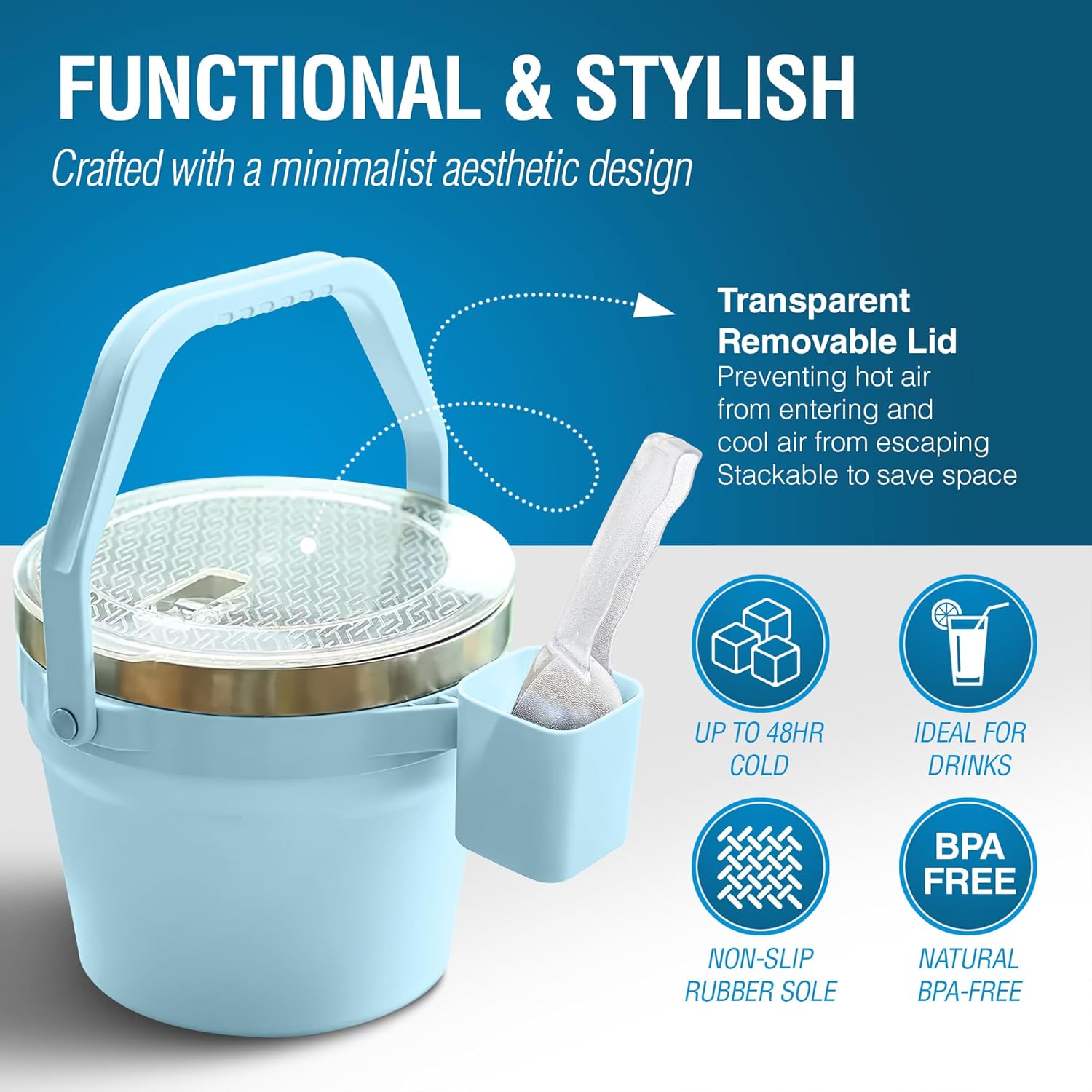 - Insulated Ice Bucket With Lid; Double-wall vacuum insulation keeps ice solid longer; A stylish and functional solution for cocktail bar, patio, or outdoor entertaining