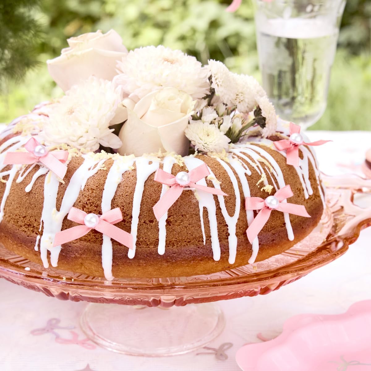 - Bridal Era: Our beautiful mini pink bows with pearls cake topper set is the party addition you've been looking for + a guaranteed hit! Each bow is 2" x 1" - they will get everyone's attention!
