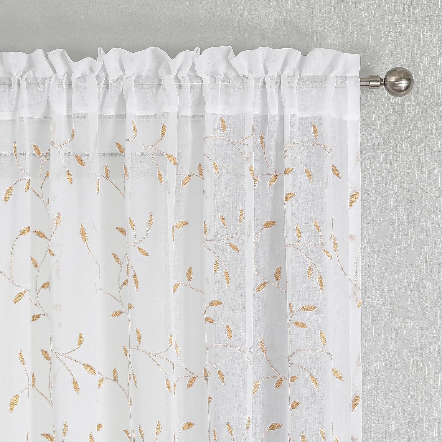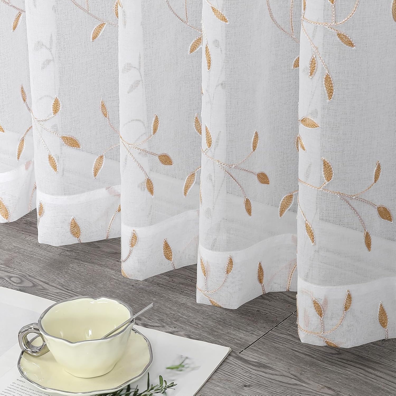 VISIONTEX White Sheer Voile Curtains, Decorative Orange Leaves Embroidery Faux Linen Rod Pocket Window Drapes for Home Kitchen, Living Room and Bedroom 54 x 54 Inch, Set of 2 Curtain Panels