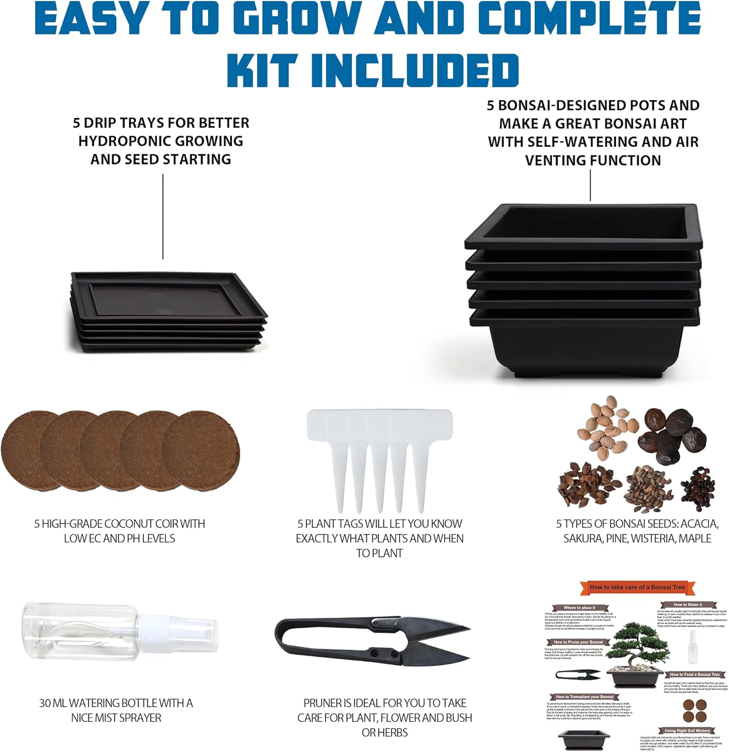 - KIT INCLUDES: 5 types of bonsai tree seeds, 5 plastic pots with drip trays, 5 soil discs, 5 plastic writable plant markers, 1 bonsai pruner, a mini tweezer, a small water bottle and a gardening guide.