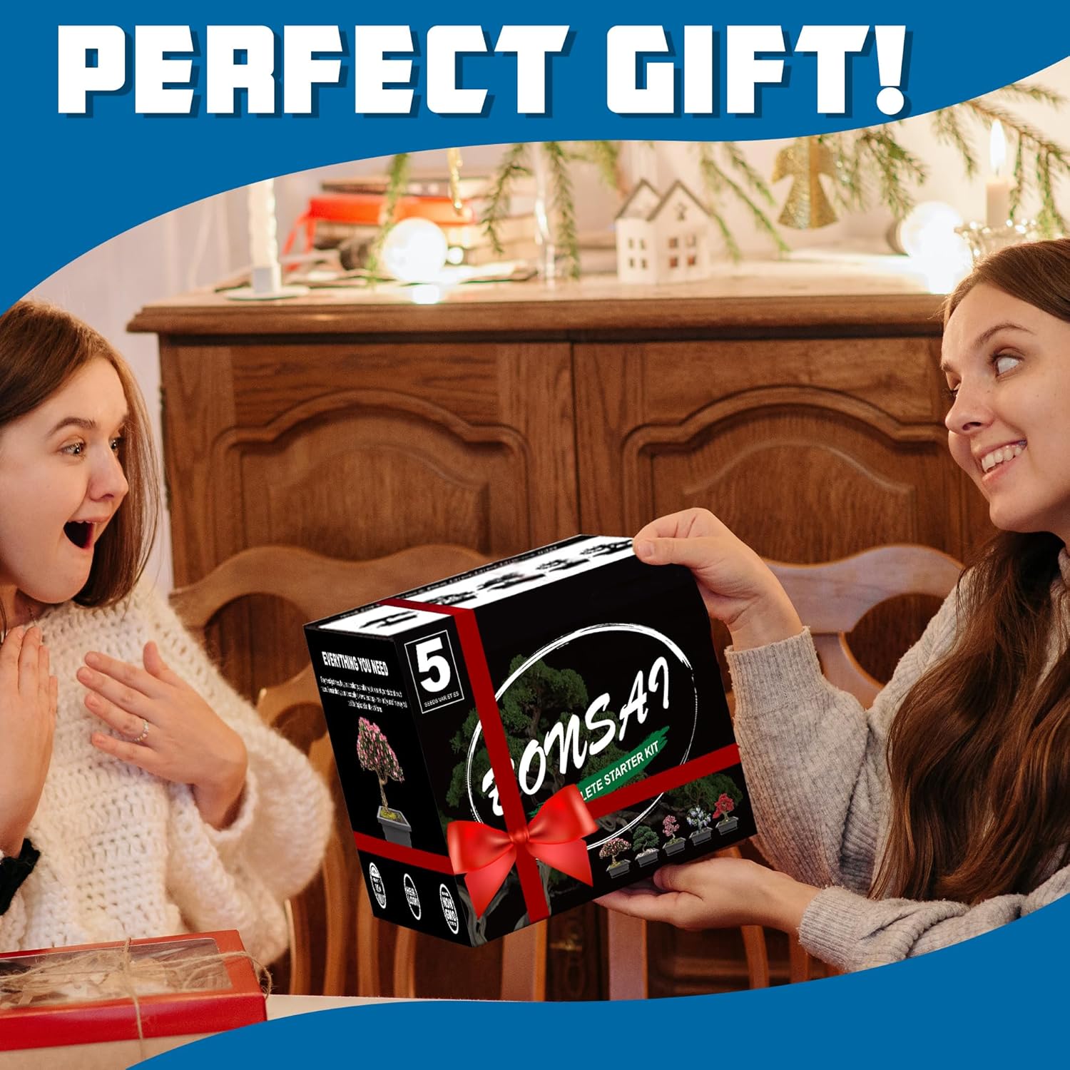Bonsai Starter Kit, 5 Seeds Growing into Acacia, Wisteria, Sakura, Red Maple and Black Pine, Including Complete Gardening Tools with A Gift Box, Christmas Gifts for Men Women Beginners