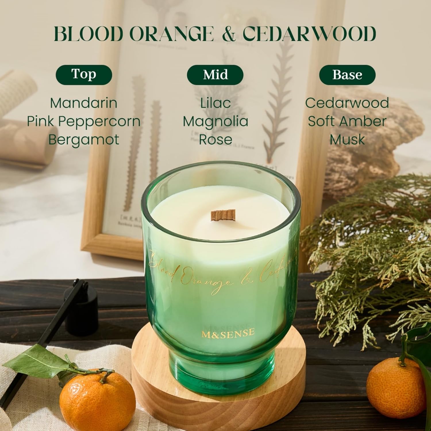 M&SENSE 16.6oz Natural Soy Large Jar Candle with Wooden Wick | Blood Orange & Cedarwood Scent | 95-Hour Burn & Long-Lasting Burn | Housewarming Gift for Men and Women