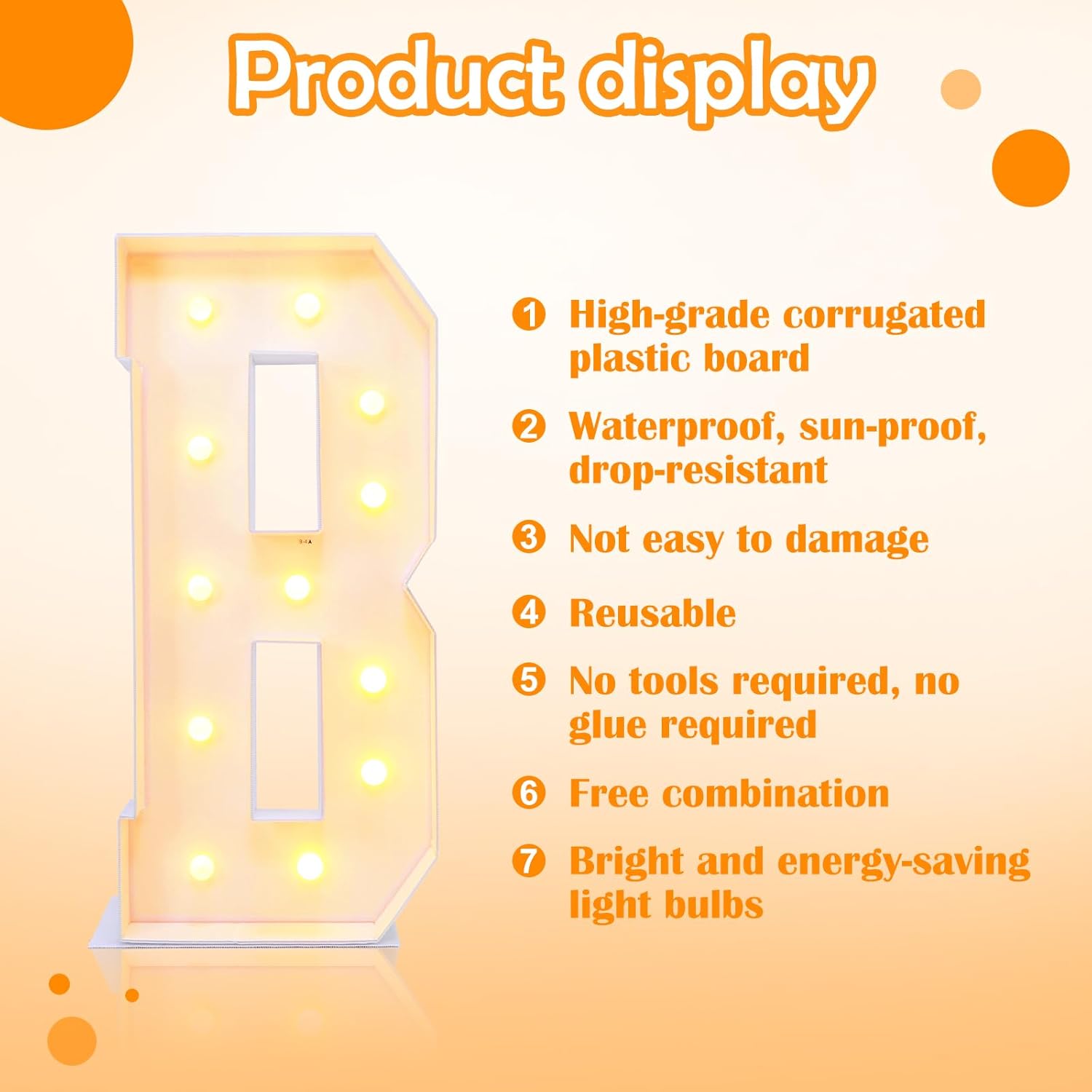 - Easy To Assemble Light Up Letters: Our unique 4ft marquee light up letters 4ft are not afraid of water and is not easily damaged. Pre-cut boards with clear markings help you set up your marquee light up letters with minimal effort, and quickly without any tool. The combination of letter balloons and fake flowers will make the decoration full of vitality, romance, and joy, adding a sense of celebration to the party. Oh baby letters, Letter B
