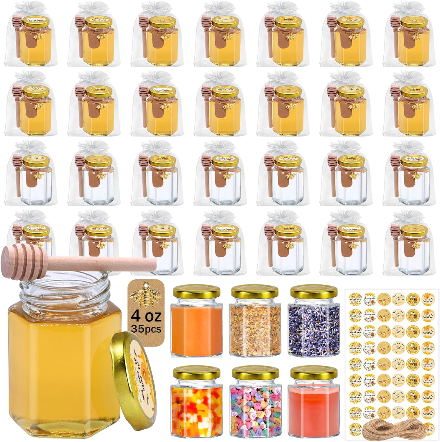- Great Value Mini Honey Jars Set: This set includes 35 round mini honey jars with dippers, lids, stickers, bee charms, gift bags, tags, and 50m of jute twine. Everything you need to craft thoughtful party favors or sweet handmade gifts with ease.