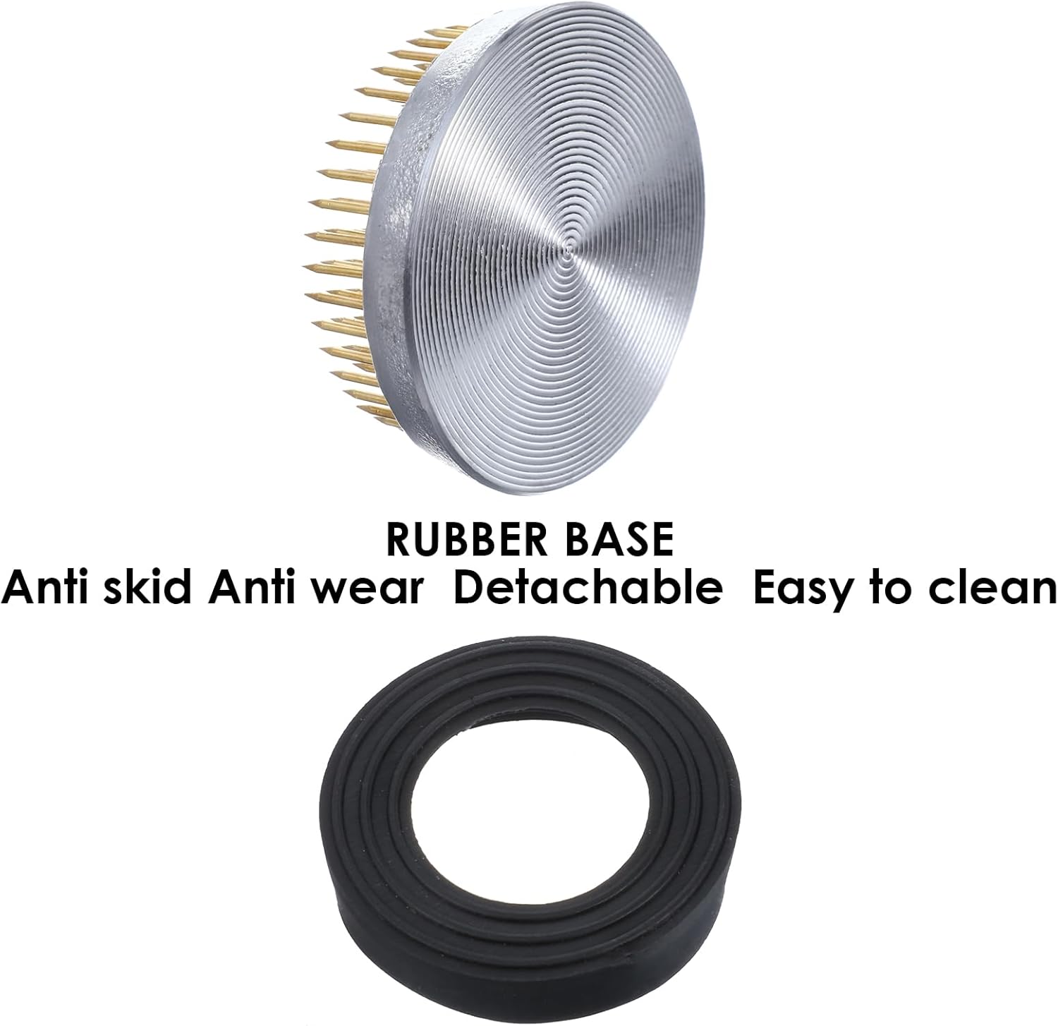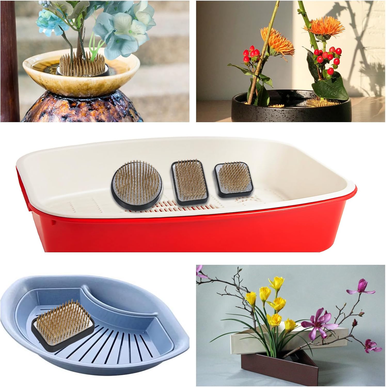 - ★Material. Brass pin and lead base with rubber non-slip pads (Brass is a material that does not rust easily. The surface of the lead base will form a gray surface layer after long-term use, and this surface layer is easily mistaken for rust. But in fact this is a protective film that can extend Kenzan’s life span. Beside, this Kenzan set is equipped with rubber non-slip pads, which can improve the stability of the flower frog and prevent the metal flower frog from damaging the container.