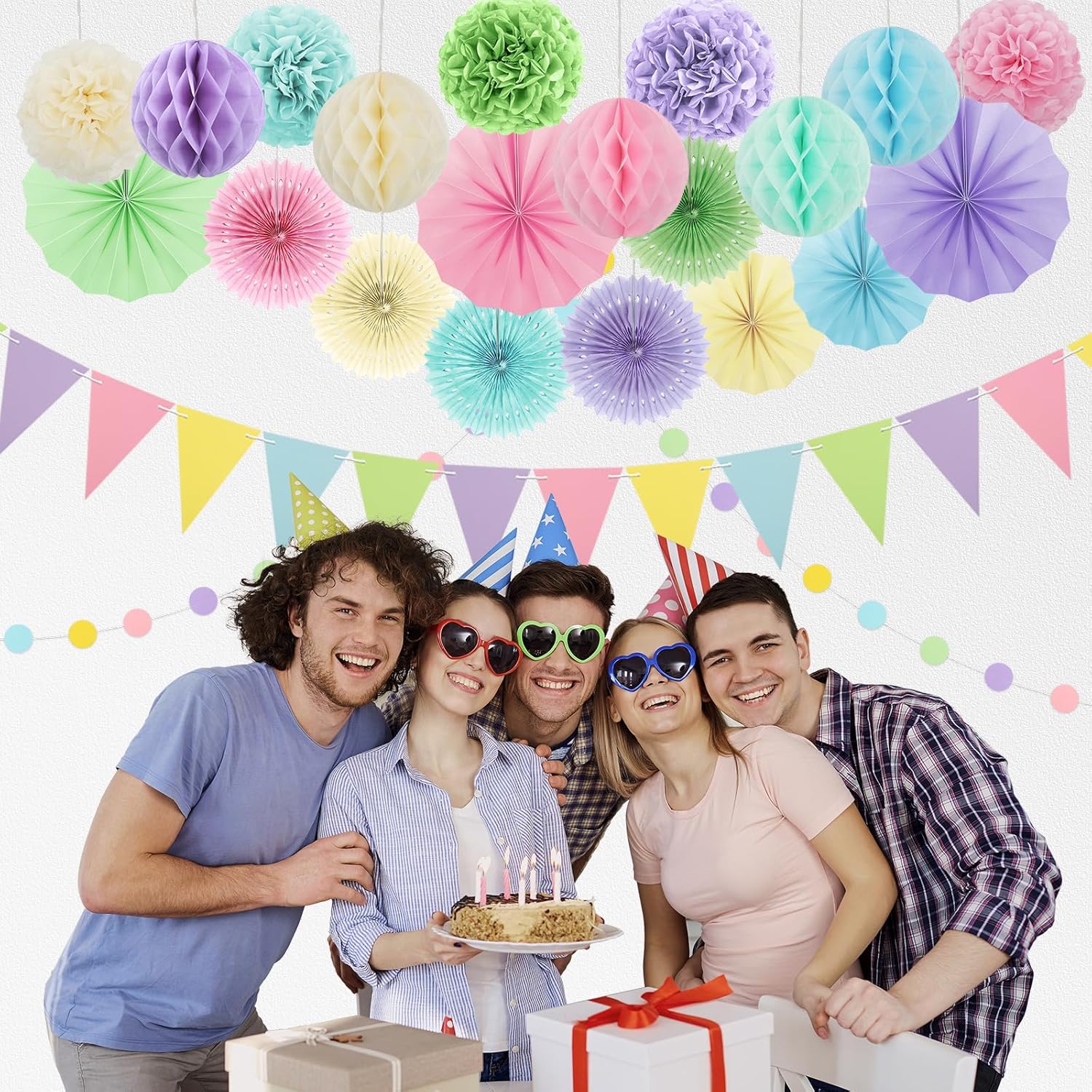 Pastel Party Decorations, 24Pcs Birthday Classroom Baby Shower Decor with Hanging Paper Fans, Pom Poms Flowers Packs for Girls Kids Birthday Rainbow Party, Macaron Carnival Theme Hanging Supplies