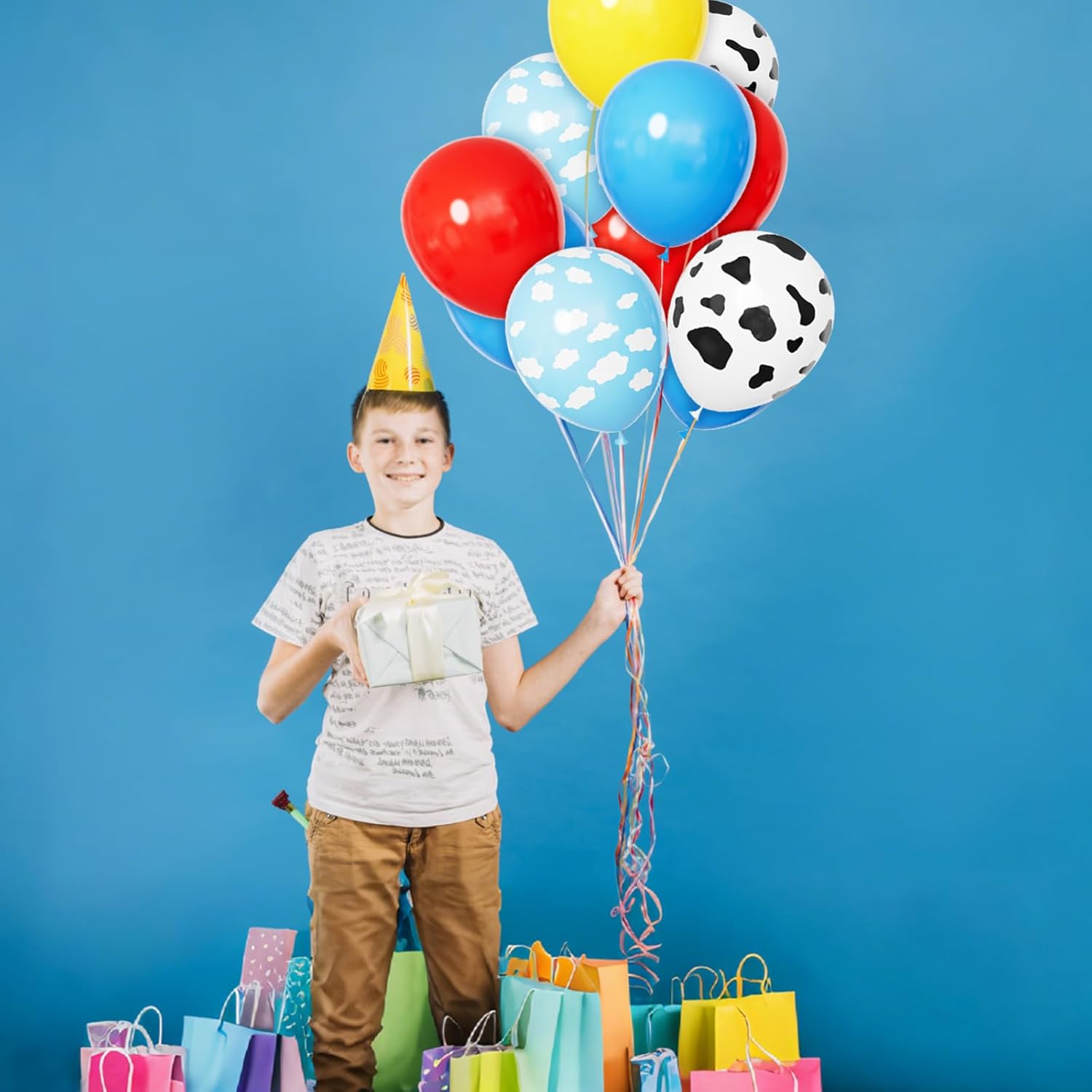 - 【Balloons Packing 】12 Inch balloons pack: Package includes 16 pcs light blue balloons, 16 pcs red balloons, 16 pcs yellow balloons,10 pcs cow balloons and 10 pcs could balloons with 2 ribbons.