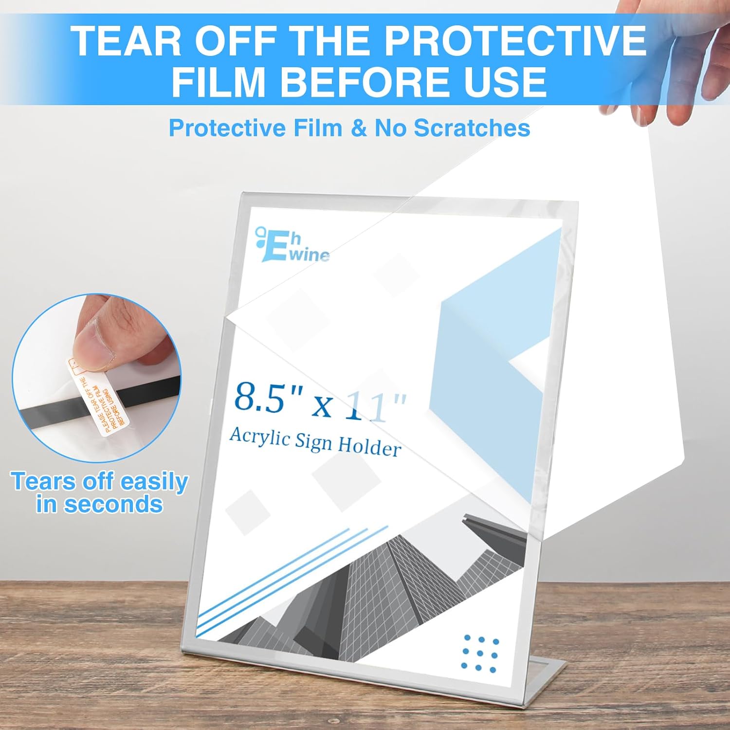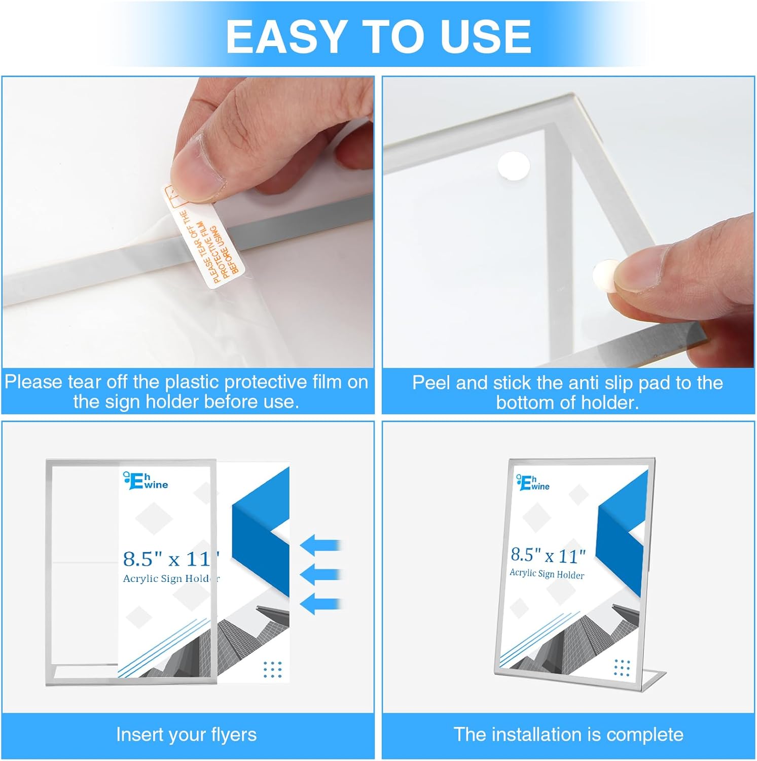 - Easy to Use: Insert 4 anti-slip pads into the base, Each of our Acrylic Sign Holder comes with a peel off film guide, follow the red arrows to peel off the film in seconds, and the plastic sign holder has an opening on its side for easy paper insertion